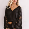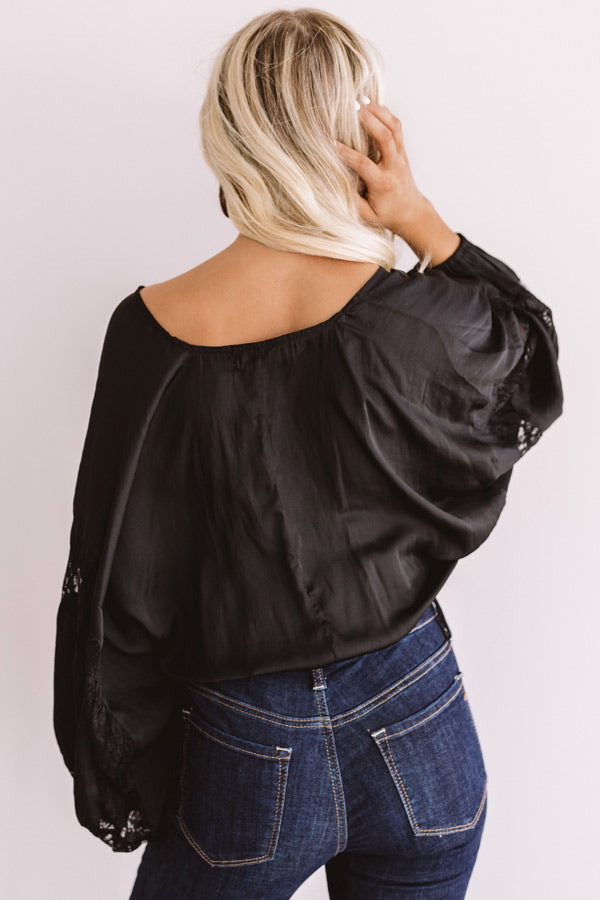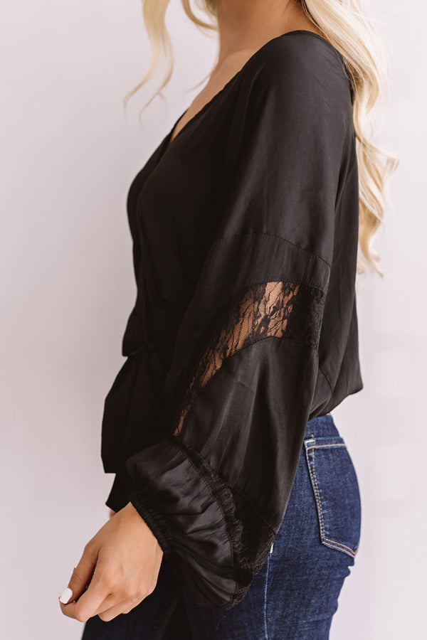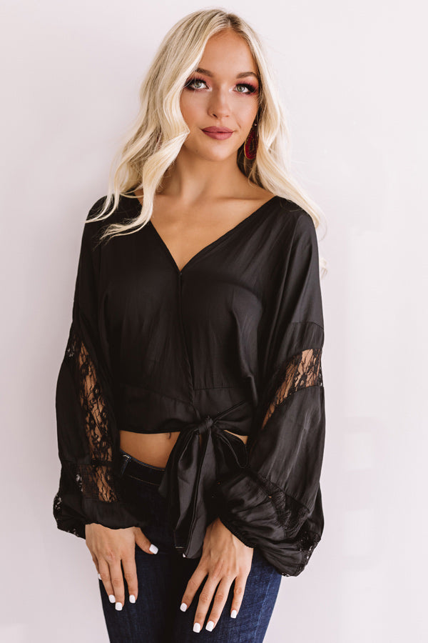 Strut down "Fifth Avenue" in style with this chic black top featuring lightweight satin material, a wide v-cut neckline with a rounded upper back, long oversized bishop sleeves with elastic banded cuffs and lace detailing, and a relaxed wrap bodice that falls into a tied front hemline and a straight back hem! This elegant piece styles perfectly with some dark wash ankle skinnies, a leopard clutch, and a maroon pump and statement earrings, or it can be worn with our "Weekend In NYC Ribbed Velour Skirt in Ecru Olive," a faux suede hat, and "The Cadence Faux Suede Thigh High Boot!" Measurements