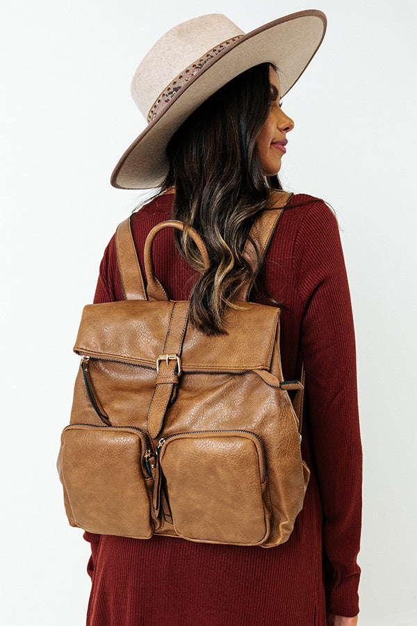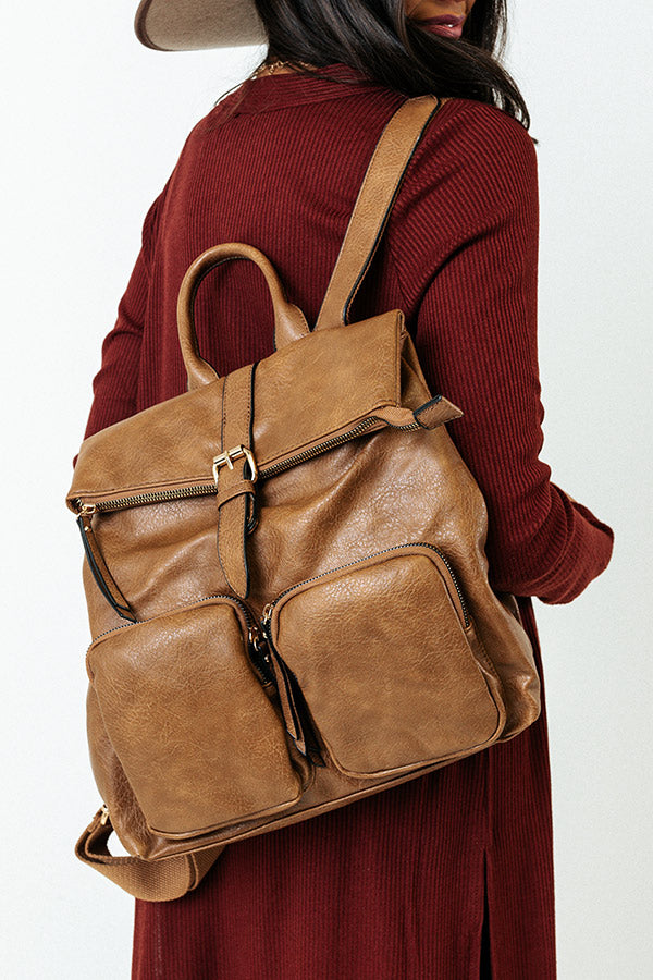 Our adorable 'Figure It Out' backpack features brown hued vegan approved faux leather material, gold toned hardware, a single handle, two adjustable shoulder straps, two small zip closure pockets on the front, a zip closure pocket on the back, and a spacious fully lined pouch with a flap zip and buckle closure plus an additional inside pocket!
