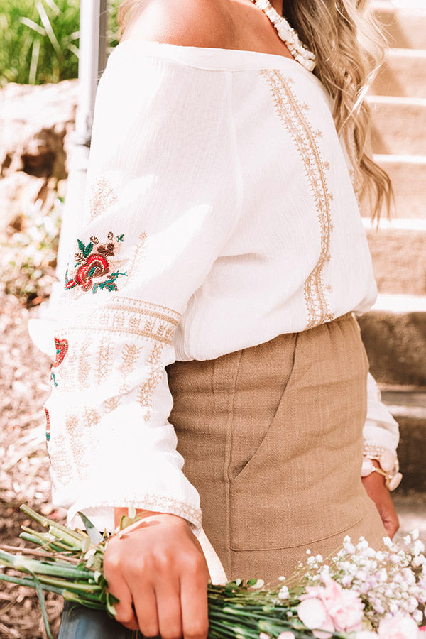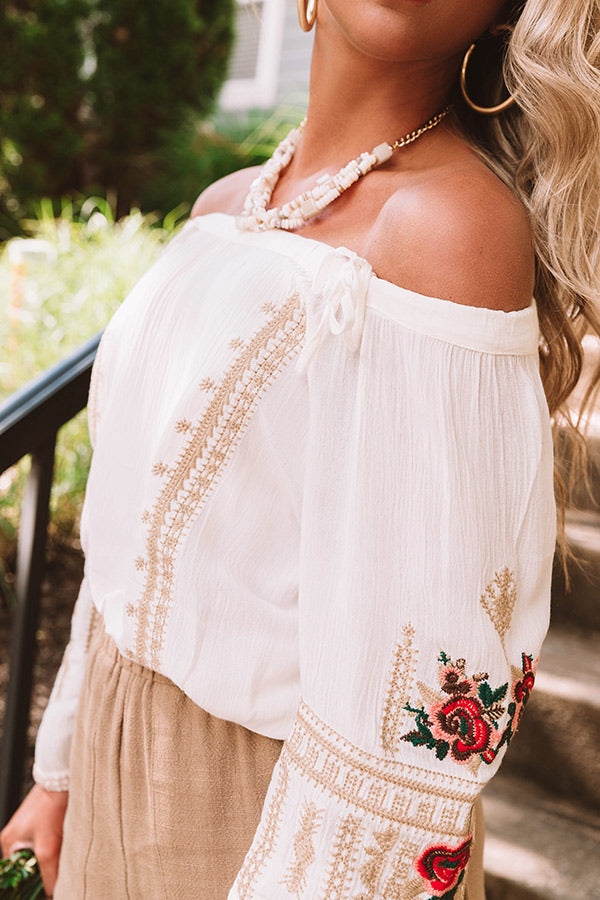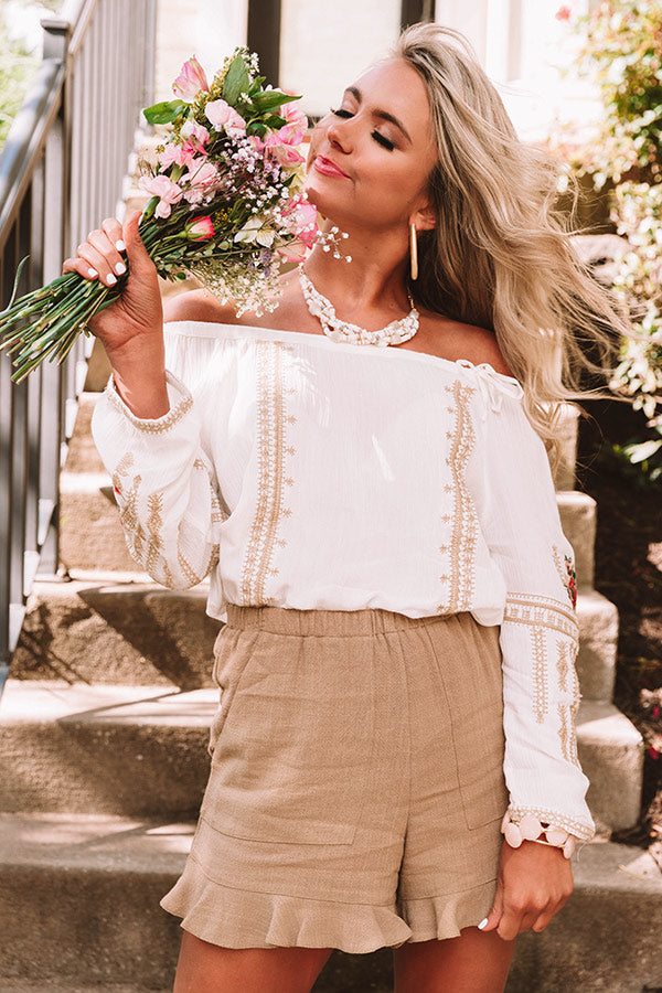 You are sure to turn heads when you wear our flirty white "Fiji Fling" top featuring lightweight material patterned with subtle texturing and abstract neutral and vibrant floral embroidered detailing, an elastic off shoulder fit with a straight neckline, long oversized bubble drop sleeves, and a relaxed silhouette that falls into a straight neckline! You can style this adorable piece a variety of ways, like with some matching ruffle shorts, a statement necklace, and white wedged booties, but you can also wear it with some distressed ankle skinnies, our red "Holden Heel," our "All Caught Up Headband in Khaki," and our "Free And Fearless Fringe Crossbody in Hunter Green!" Measurements