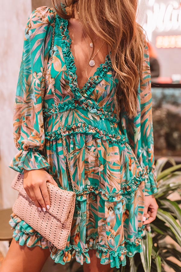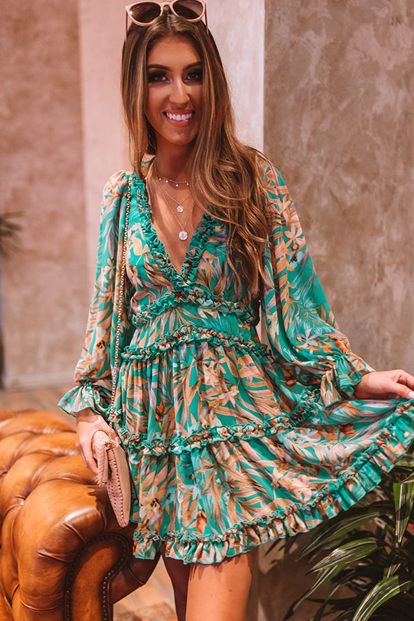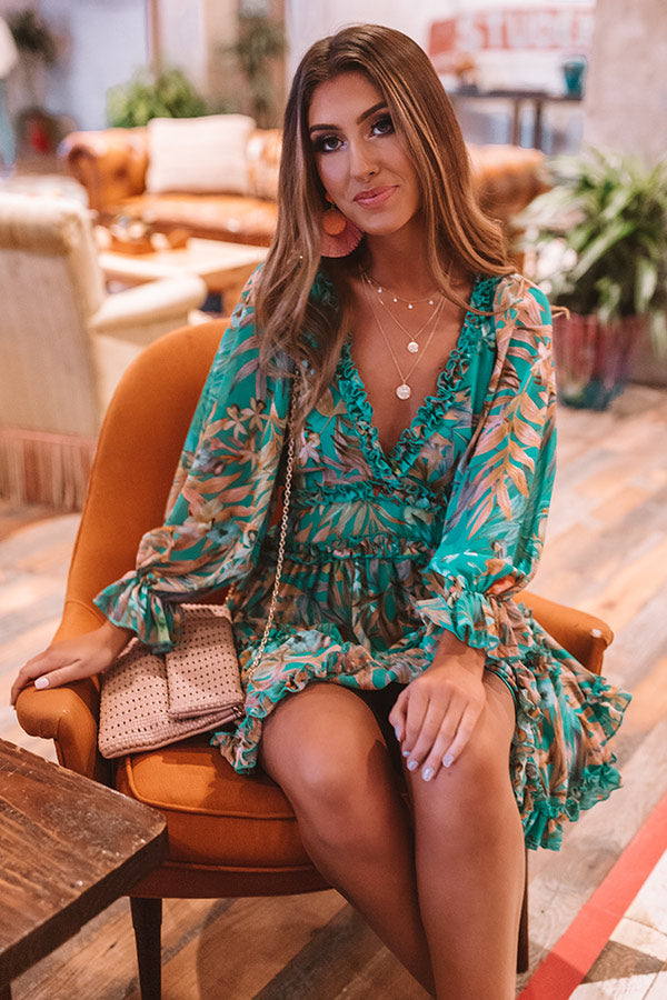 You are sure to flourish in Fiji when you wear this striking turquoise hued dress featuring lightweight breezy material patterned with a bold pastel hued floral print, a deep v-cut neckline, exposed ruffled seam and trim detailing, long loose bishop sleeves with fitted smocked cuffs, a cutout lower back with button closures, and a fitted waistband that falls into a relaxed skirt silhouette with an uneven mid-thigh length hemline! We have styled this flirty piece with a blush wedge, statement earring, and crossbody, but you can also wear it with "The Tory Heel in Marigold" and our "Say It Ain't Soho Hat in Marigold!" Measurements
