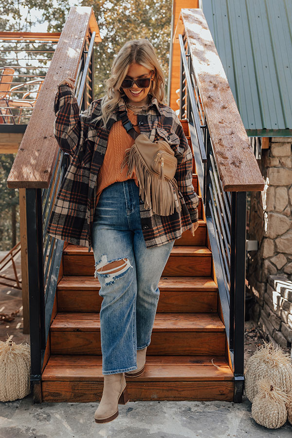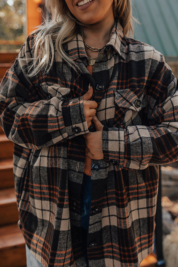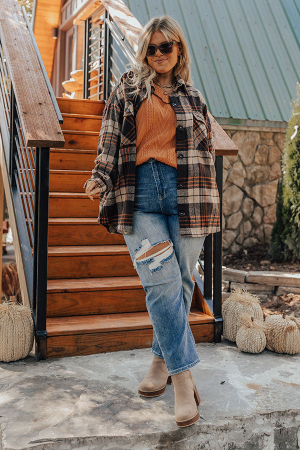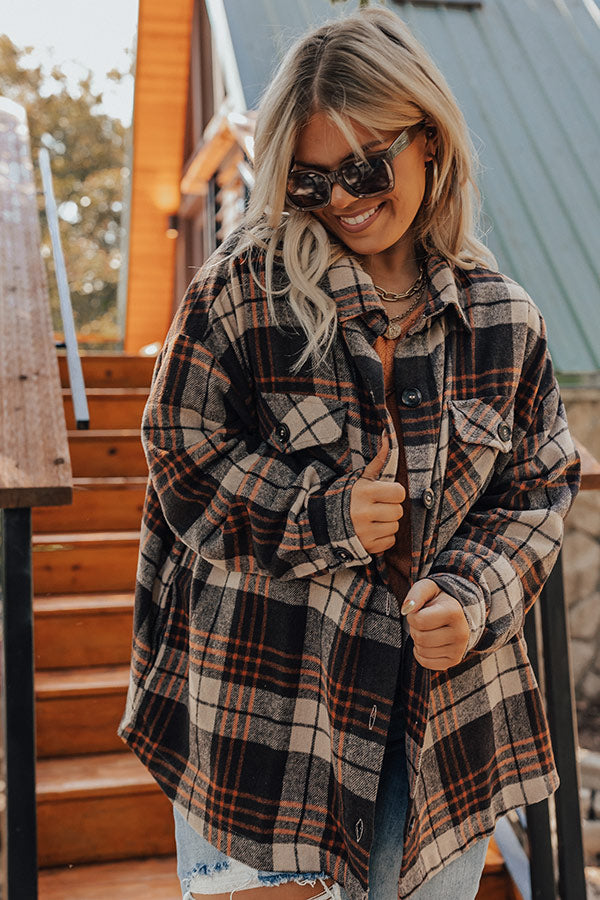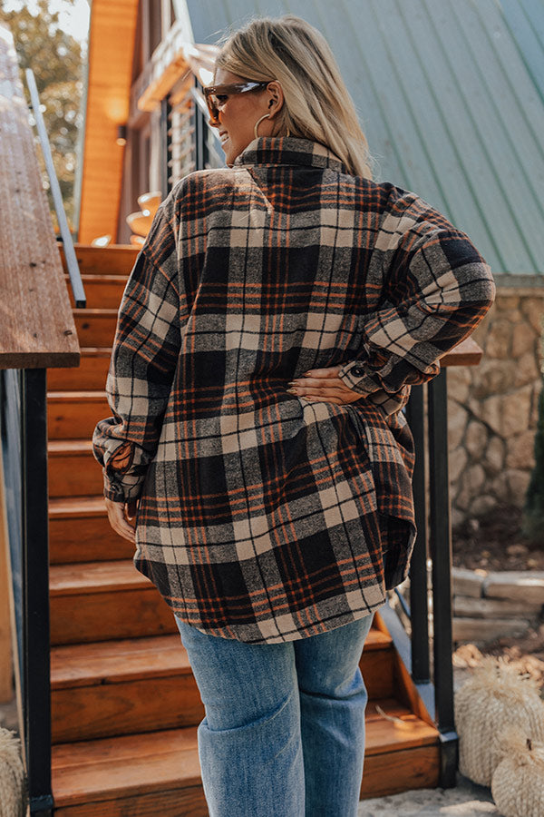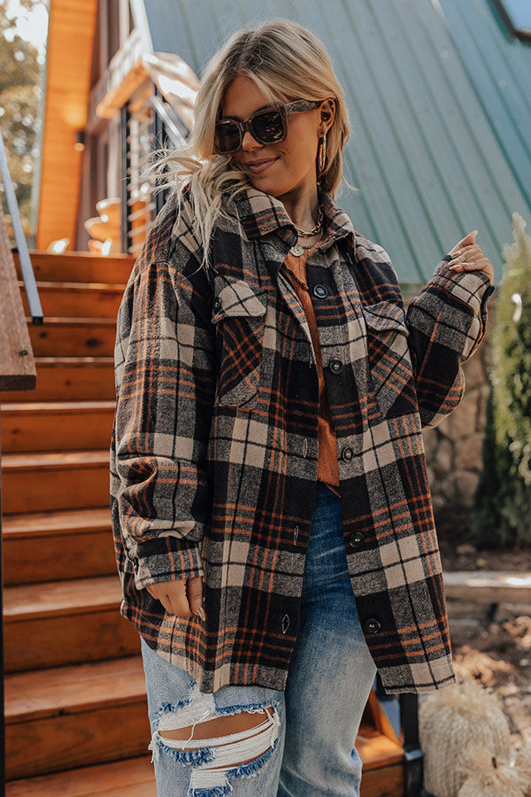 Say hello to pumpkin spice season in our 'Find Me By The Bonfire' jacket! Features lightweight chestnut, orange, and ivory hued plaid material, button up front with collared neckline, two functional pockets with button-flap closure, long loose sleeves with button closure cuffs and a relaxed silhouette that falls into an uneven rounded hemline.