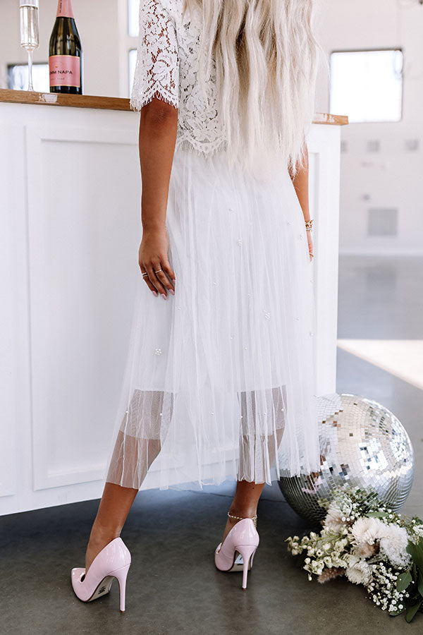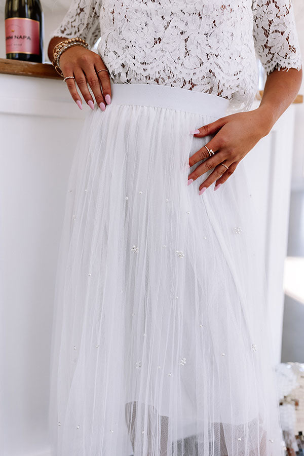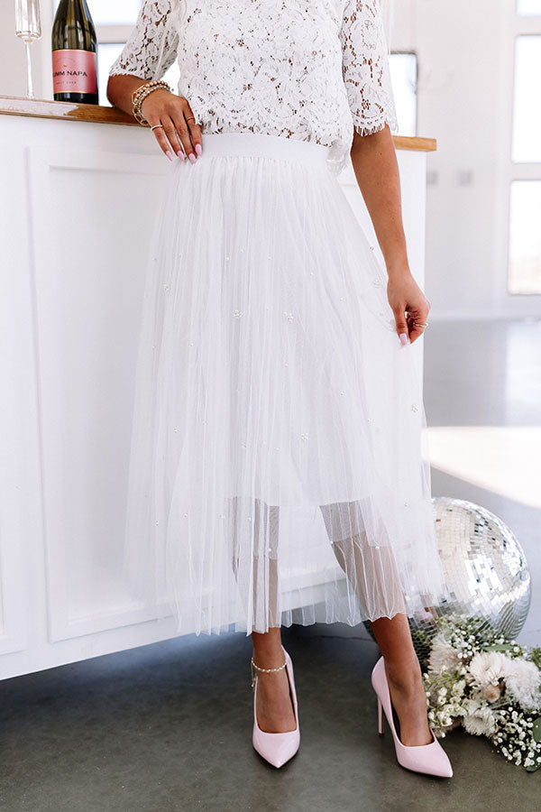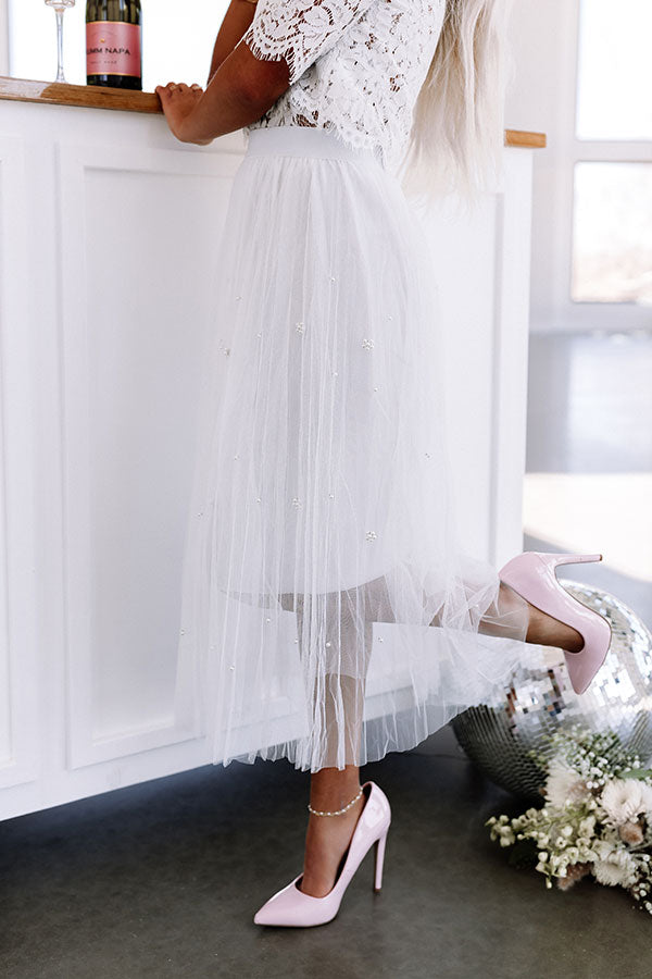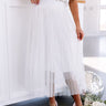 Let your light shine bright in this charming white skirt featuring lightweight semi-sheer tulle material with a solid slip underneath, an elastic waistline, subtle pearl detailing, and a relaxed silhouette that falls into a straight mid-calf length hemline!