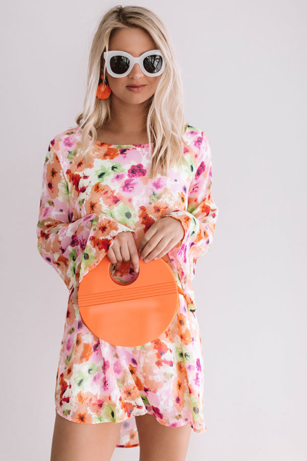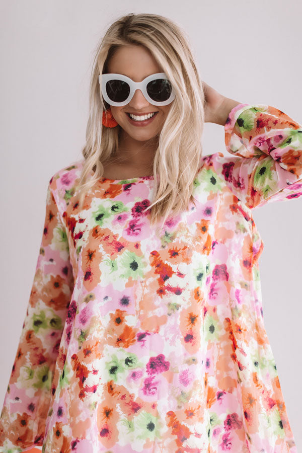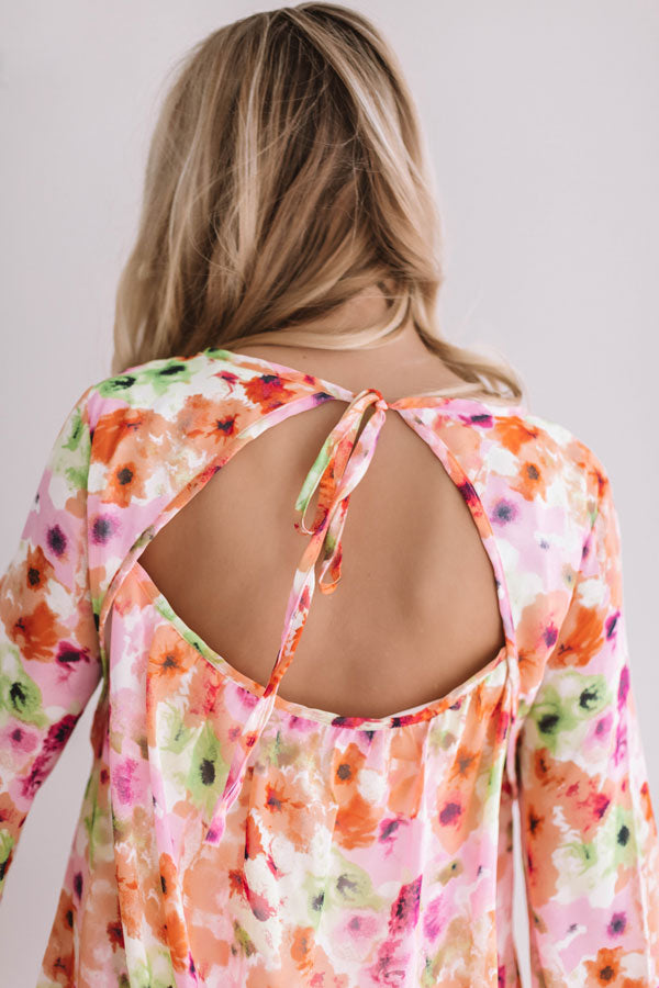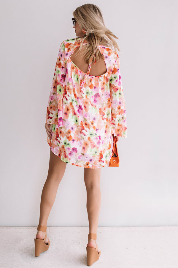You're sure to find paradise in this colorful cutie! This bombshell babe has long bell sleeves, a breezy floral printed chiffon silhouette & a flirty open back that ties at the back of the neckline. Add a colorful statement earring & a sassy pair of wedges for a fun look that's sure to make a splash!