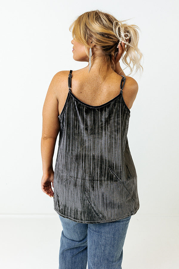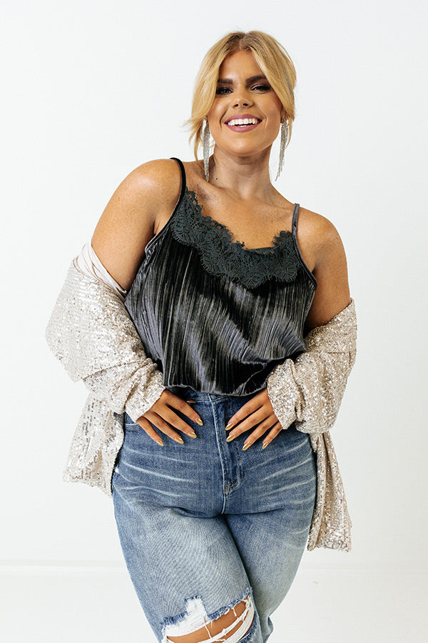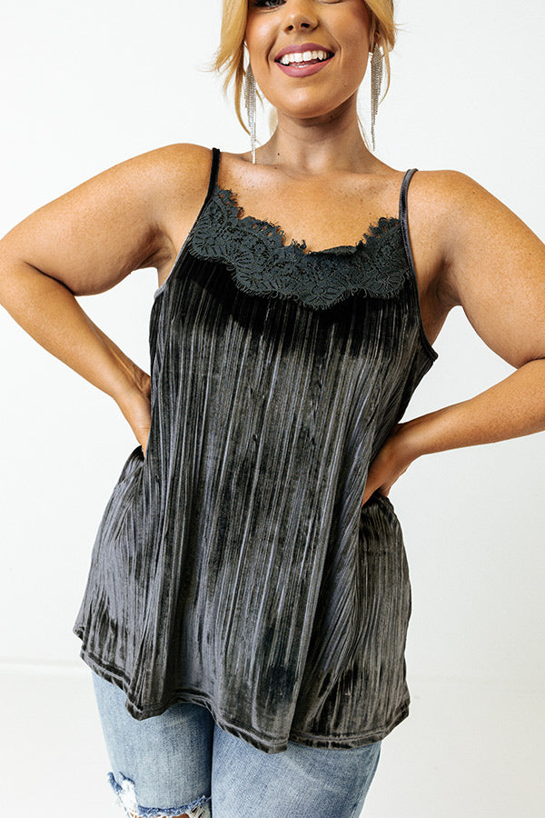 The perfect fall layering piece, our darling charcoal colored plus size 'Finding Romance' tank features velvet material with ribbed texturing, an intricate lace v-cut neckline, adjustable spaghetti straps, and a relaxed silhouette that ends in a straight hemline!