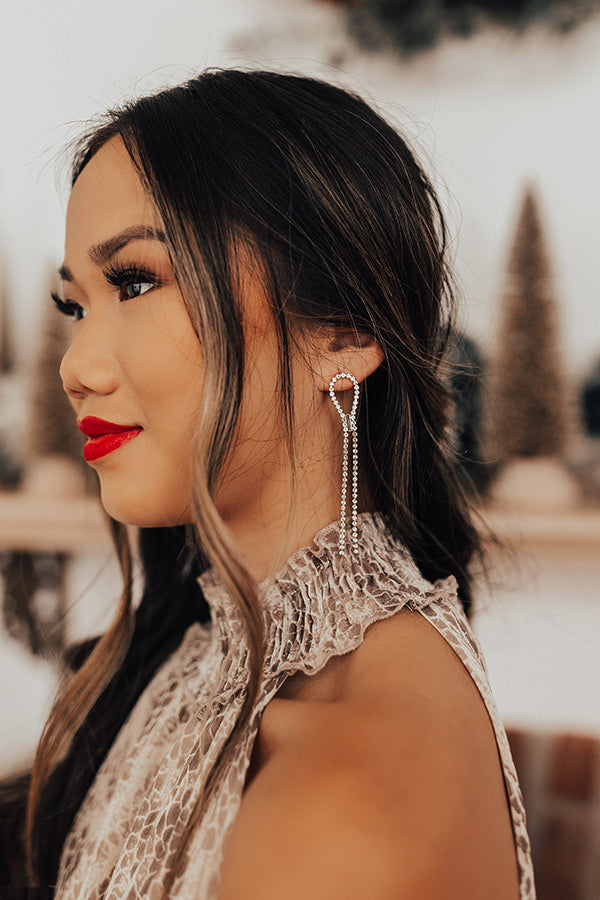 You are sure to look do divine in these pretty earrings featuring a rhinestone upside down teardrop hoop stud with two rhinestone tassel pieces!