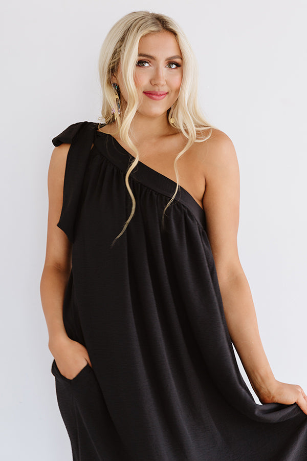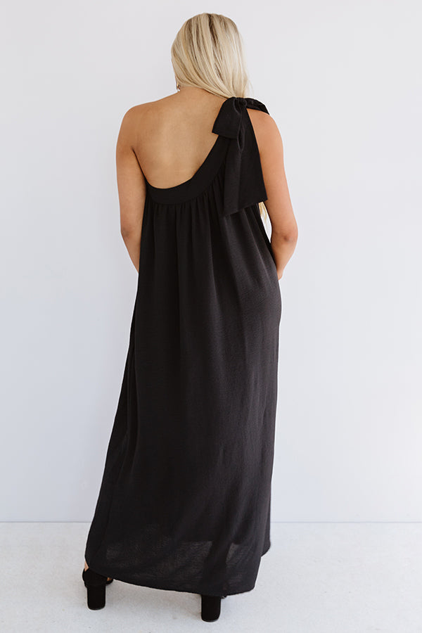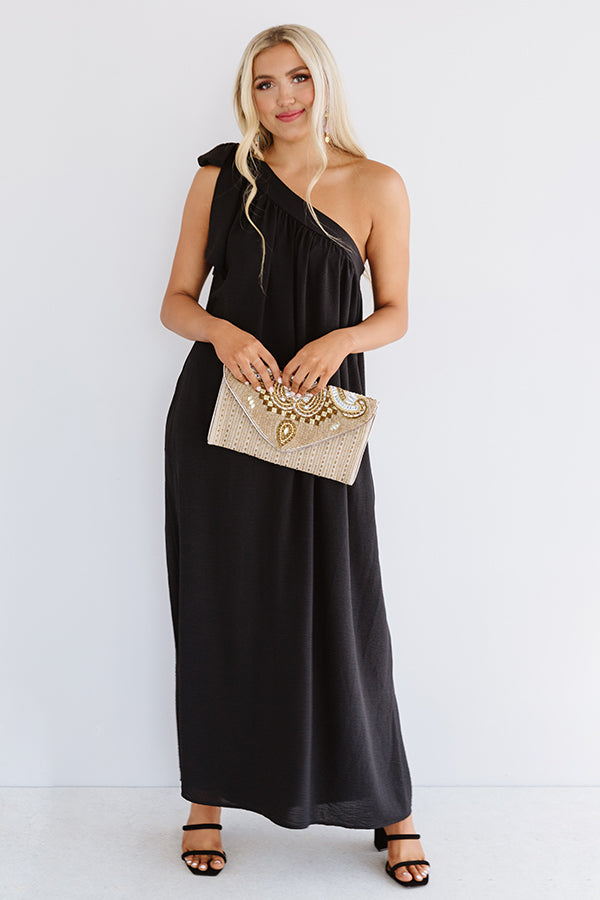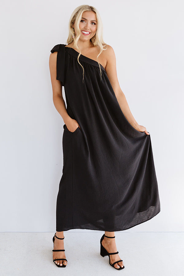 You will look "fine like wine" when you wear this chic black maxi dress featuring lightweight breezy material, a diagonal neckline with a 1-inch tie closure shoulder strap, accent side pockets, and a relaxed silhouette that falls into a straight floor-length hemline! We have styled this elegant piece with some matching black heels and an embellished clutch, but you can also wear it with "The Carolina Heel in Gold" and our "Glimpse Of Gorgeous Embellished Headband in Black!" Measurements