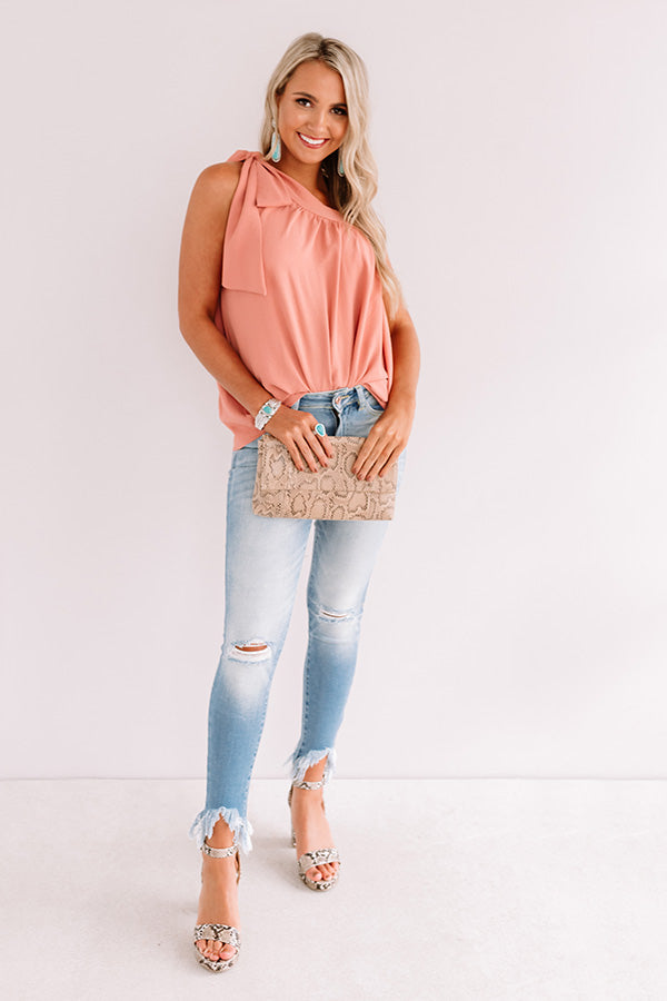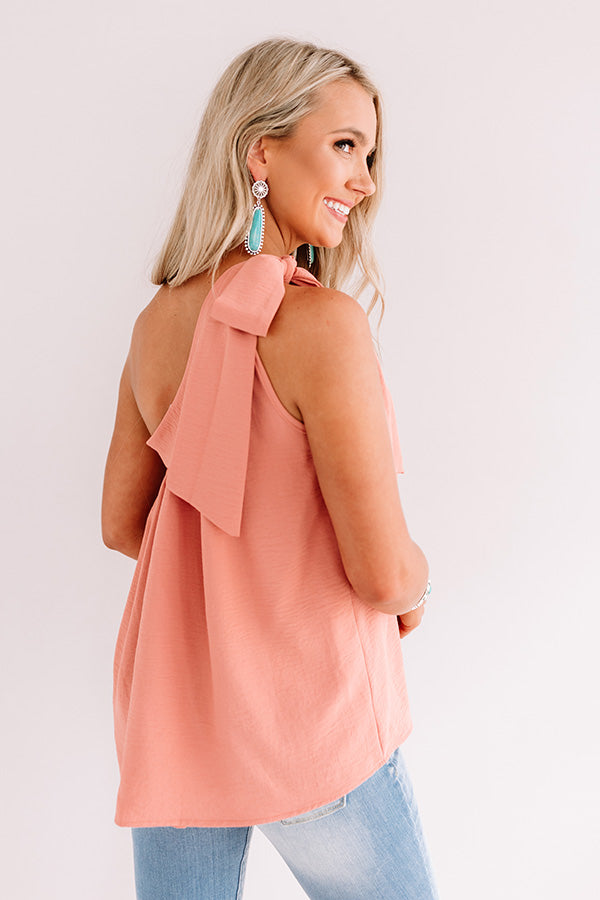 You will look fine like wine when you wear this chic blush colored top featuring sleek lightweight breezy material, a diagonal neckline with a 1-inch tie closure shoulder strap, and a relaxed silhouette that falls into a rounded hemline!
