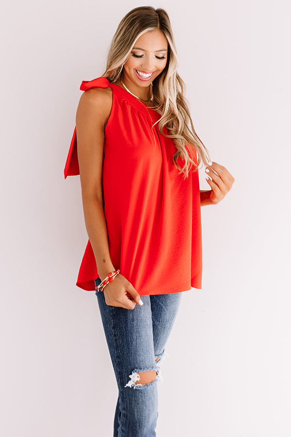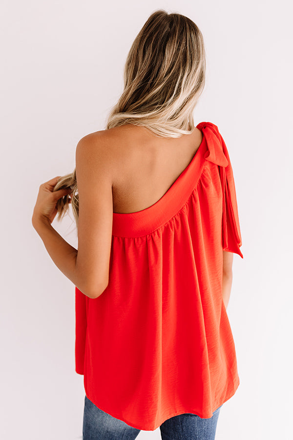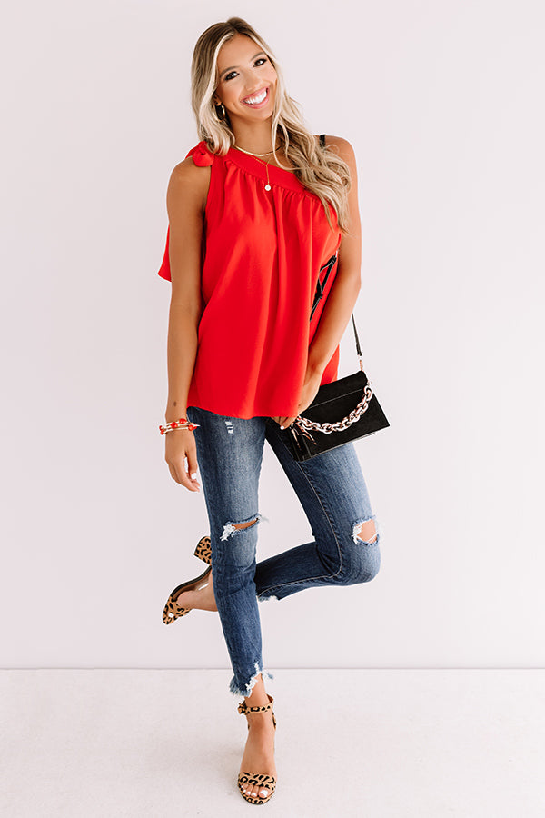 You will look "fine like wine" when you wear this chic red top featuring lightweight breezy material, a diagonal neckline with a 1-inch tie closure shoulder strap, and a relaxed silhouette that falls into a rounded hemline! We have styled this elegant piece with some distressed dark wash skinnies and a leopard heel and crossbody, but you can also wear it tucked into our "Floral Splurge Skirt," "The Melina Faux Leather Heel in White," and our "Boston Balcony Floral Hair Scarf!"