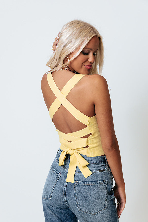 Keep cool all summer long with our timeless yellow 'Finest Wine' top featuring lightweight stretchy material, a square neckline with wide shoulder straps, a lace up back, and a flattering form fitting silhouette that ends in a straight cropped hemline!