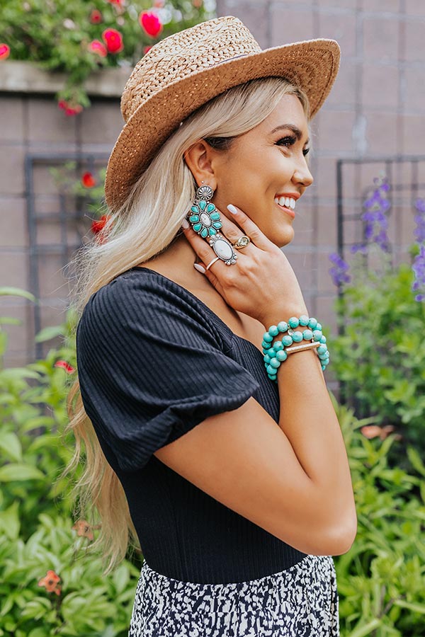 Show off your amazing accessory taste with our high end 'Finest Wine' earrings featuring silver flower studs and a dangling cream hued oval stone surrounded by ten turquoise stones!