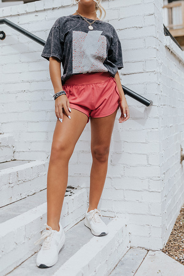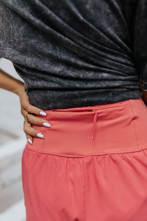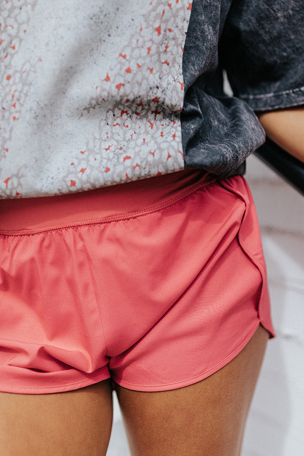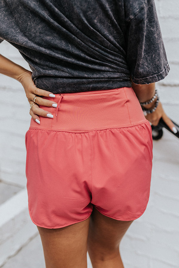 We have no doubt you will make it to the finish line in these sporty coral hued shorts featuring lightweight material, a high stretchy waistline, sewn in biker shorts underneath, an accent pocket in the back with a zip closure, and a relaxed athletic silhouette that ends in straight upper-thigh length hemlines!
