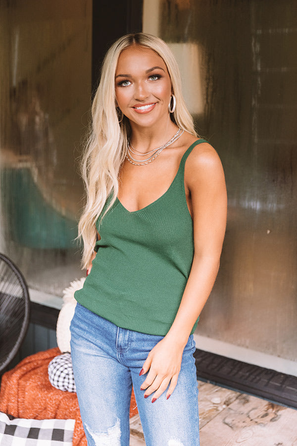Upgrade your fall neutrals with this flirty hunter green tank featuring lightweight material with subtle ribbed texturing, a v-cut neckline and upper back, 1-inch sleeveless shoulder straps, and a figure flattering silhouette that falls into a straight hemline! Measurements