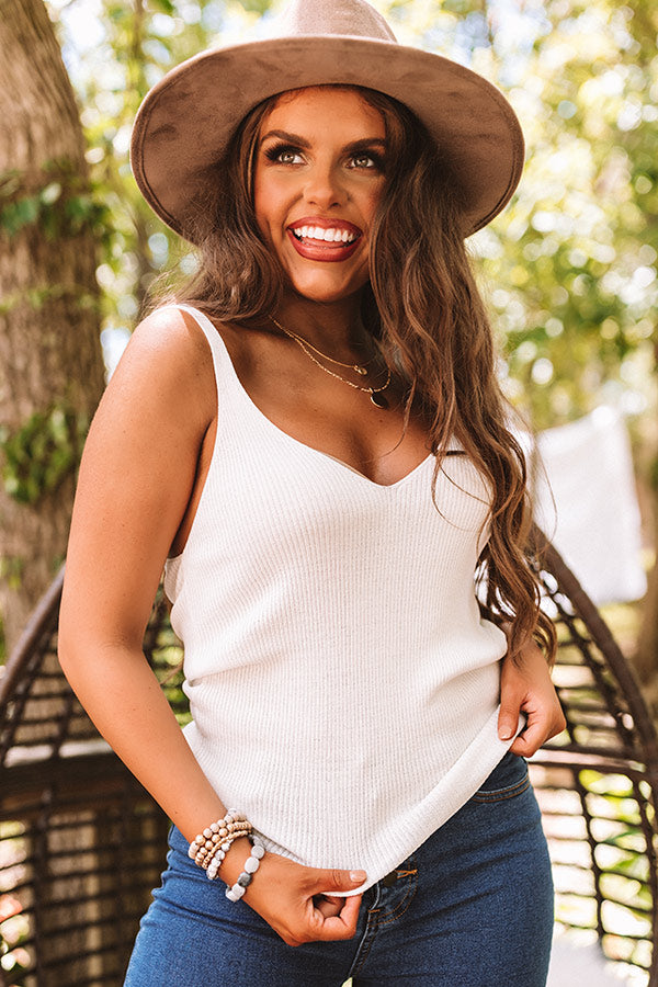 Upgrade your fall neutrals with this flirty white tank featuring lightweight material with subtle ribbed texturing, a v-cut neckline and upper back, 1-inch sleeveless shoulder straps, and a figure flattering silhouette that falls into a straight hemline! This upscale basic styles perfectly layered under a knit cardigan with some dark wash flares, matching wedged booties, and a wool hat, but you can also wear it solo with some distressed light wash shorts, "The Bellview Woven Flat in White," and our "Vacay Guru Woven Tote in White!" Measurements