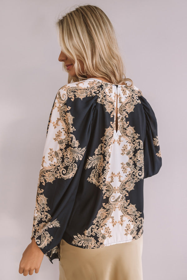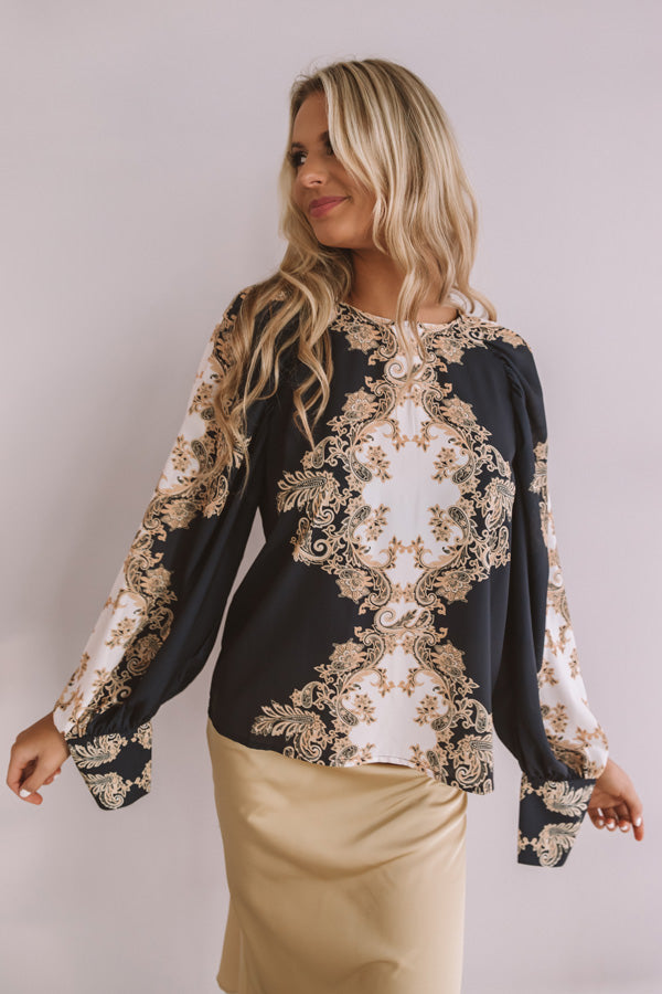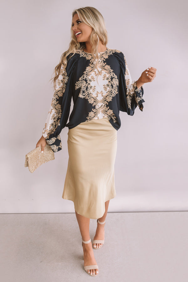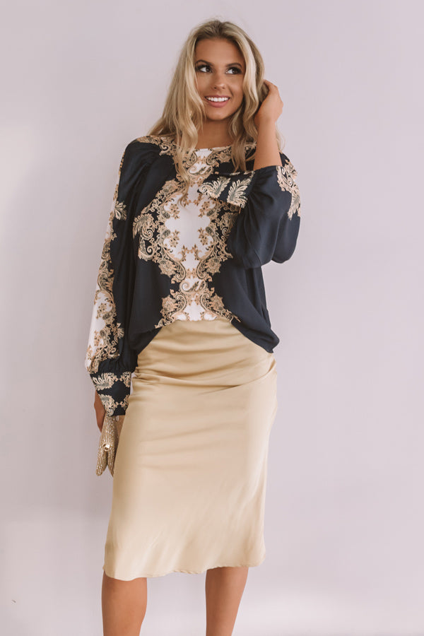 Wow the crown in our navy hued "Firelight Fancy Shift Top" featuring lightweight material with an intricate gold pattern, a high rounded neckline, long oversized bishop sleeves with fitted cuffs, a keyhole accented upper back with a button closure, and a relaxed silhouette that falls into a straight hemline! We have styled this unique piece with a satin midi skirt and a neutral heel and clutch, but you can also wear it with some distressed light wash ankle skinnies, "The Jess Faux Suede Heel in Natural," and our "All Caught Up Headband in Ivory!" Measurements