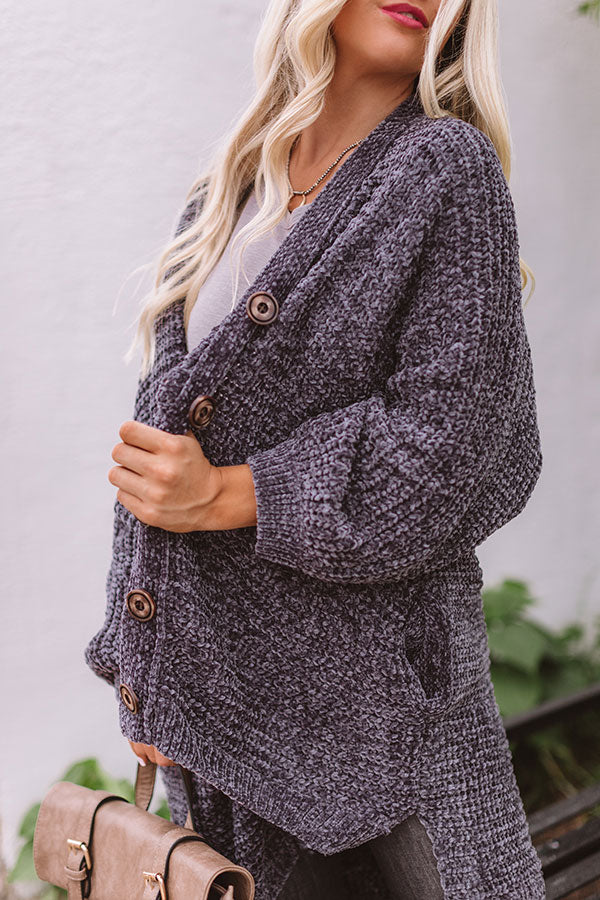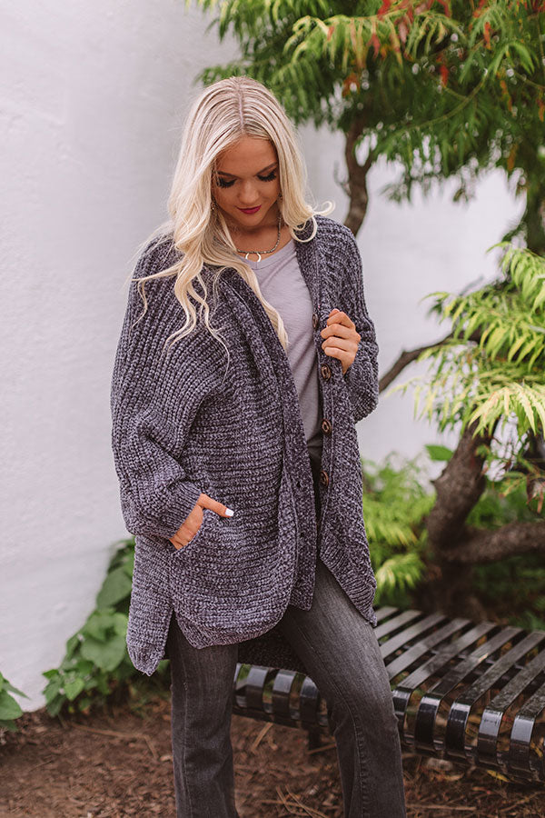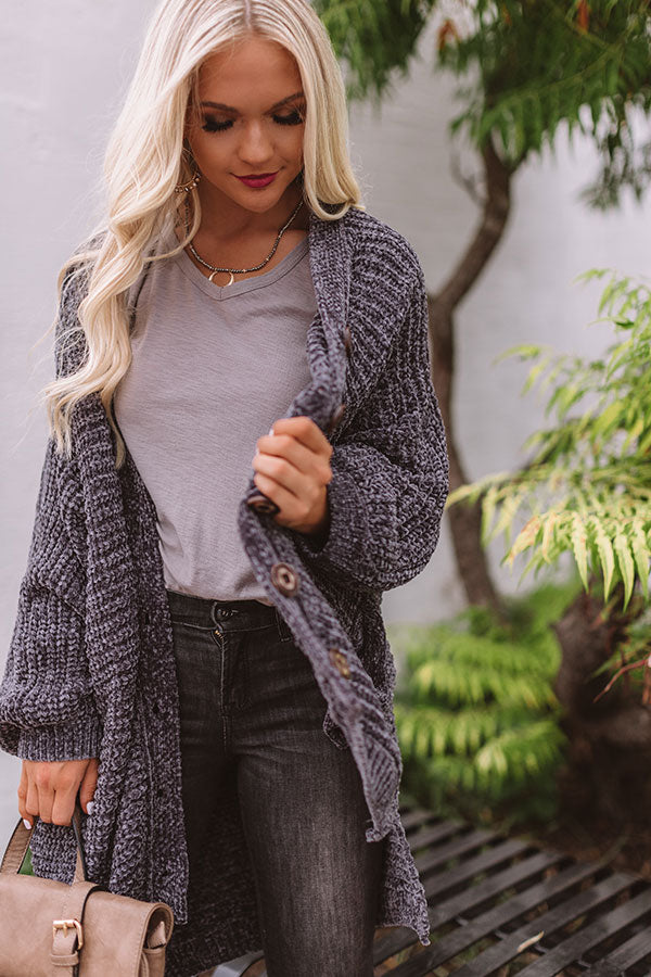There is no better piece to enjoy those "fireside chats" in than this cozy grey cardigan featuring a velvety ribbed chenille texture, a slouchy boyfriend fit, long sleeves with fitted cuffs, a straight hemline, and an open front silhouette with oversized tortoise buttons and hidden side pockets! You can style this versatile piece with just about anything from a basic tank to a sweater, jeans to dresses, wedges to sandals, clutches to totes, and hats to earrings! Here we have styled it over a basic black tee with some dark flares and a neutral bootie and backpack! Measurements
