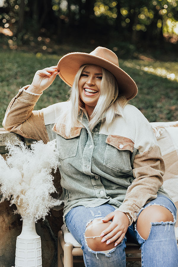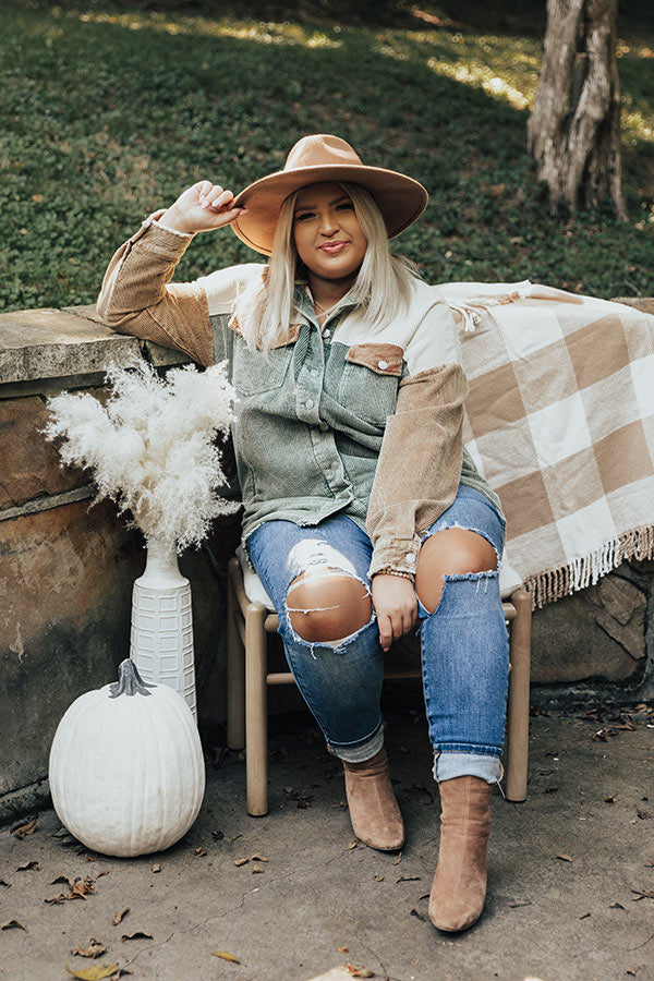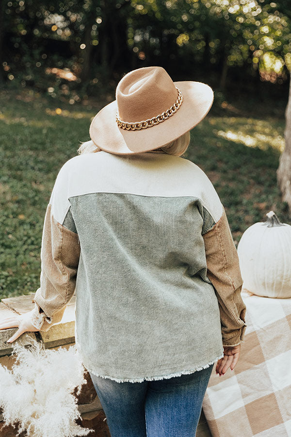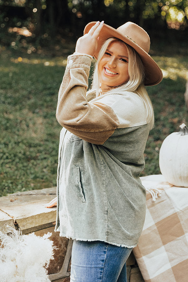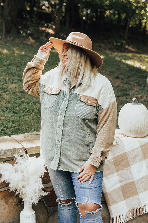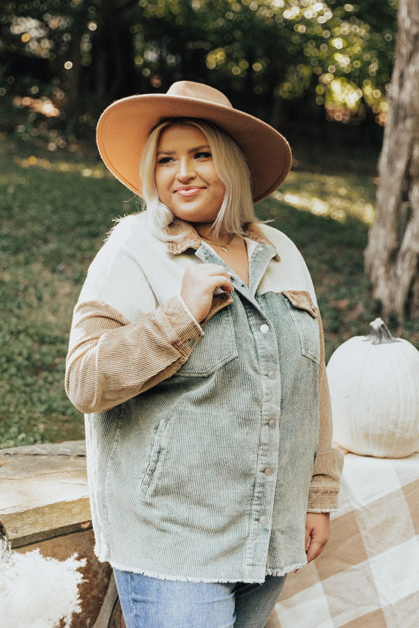 Perfect for wearing solo or as a layering piece, our trendy plus size 'Fireside Dreams' jacket featuring corduroy material with sage green, cream, and tan hued color block panels, a button down front with a collared neckline, long loose sleeves with button closure cuffs, two accent chest pockets with flap closures and two side pockets, and a relaxed but flattering silhouette that ends in a straight raw-cut hemline! Measurements