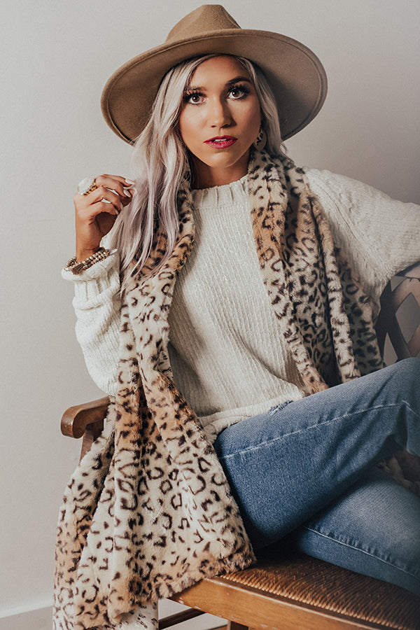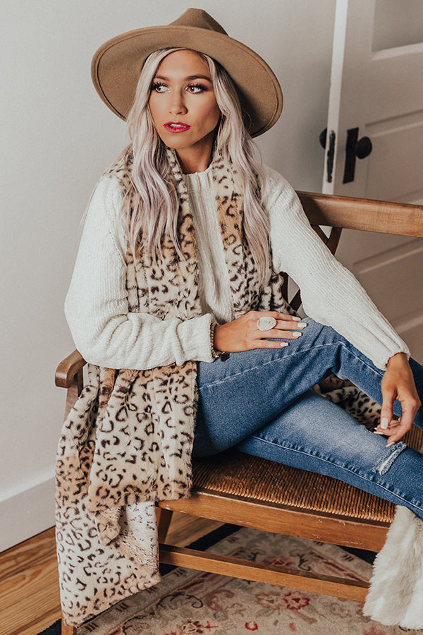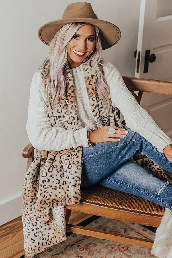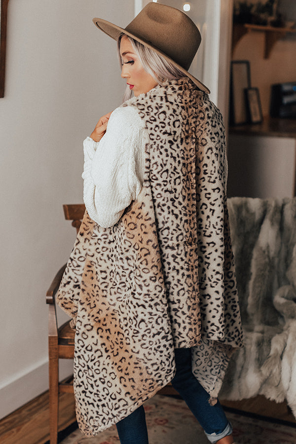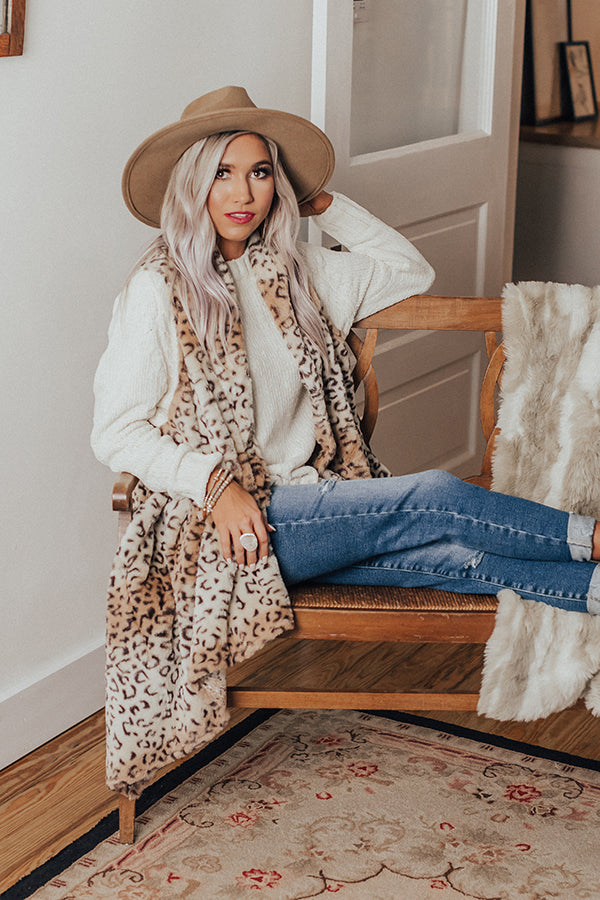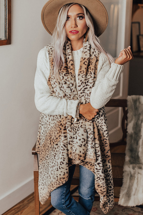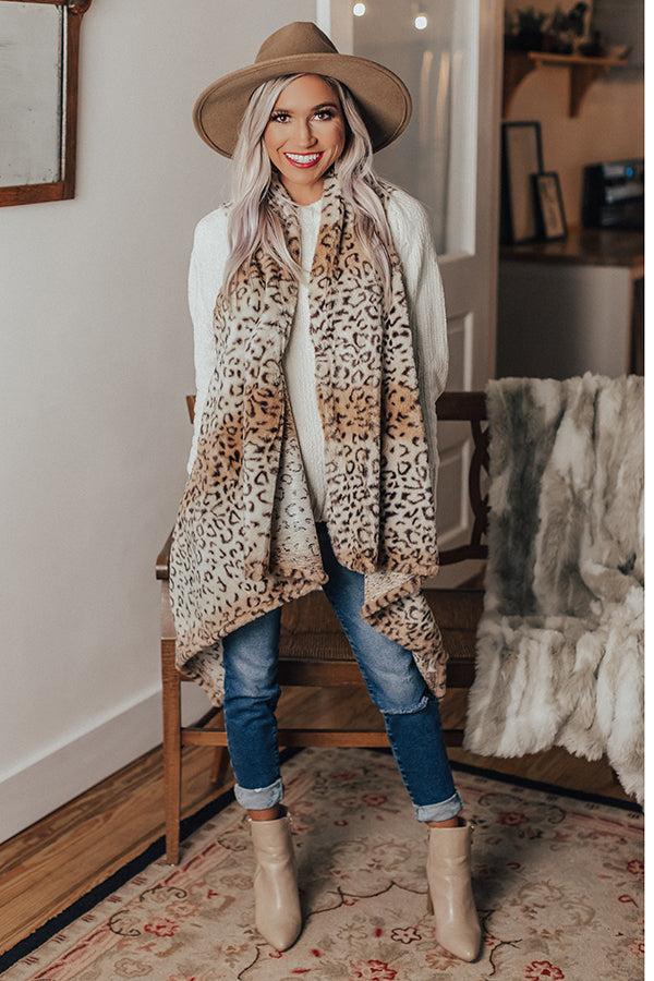 You are sure to stay warm by the fireside when you wear this neutral hued plush vest featuring soft faux fur material patterned with a black leopard pattern, wide shoulder straps, and an ultra draped open front silhouette that falls into an uneven knee length hemline! You can wear this versatile piece with just about anything from a basic tank to a sweater, jeans to skirts or dresses, booties to wedges or sandals, clutches to totes, and hats to earrings! Measurements