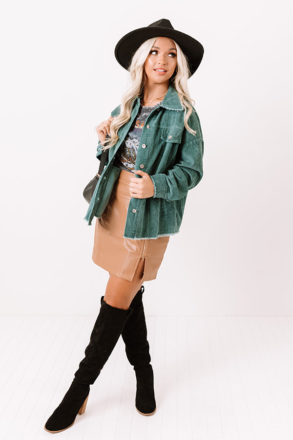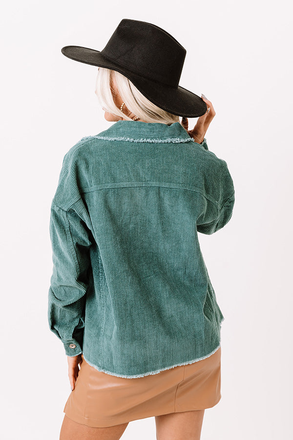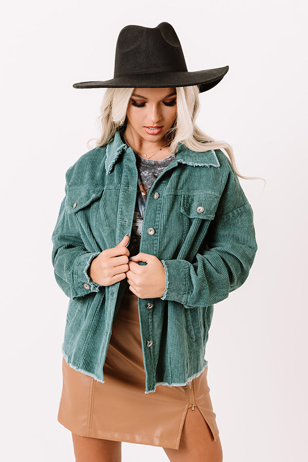 Keep your cold weather wardrobe flirty with this stylish jade colored jacket featuring lightweight corduroy material, long loose sleeves with fitted button closure cuffs, accent flap chest closures, a button down front with a collared neckline, and a slouched silhouette that falls into a rounded raw-cut hemline! Measurements