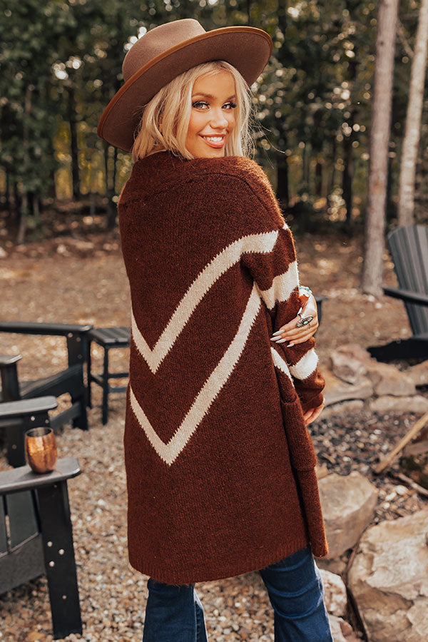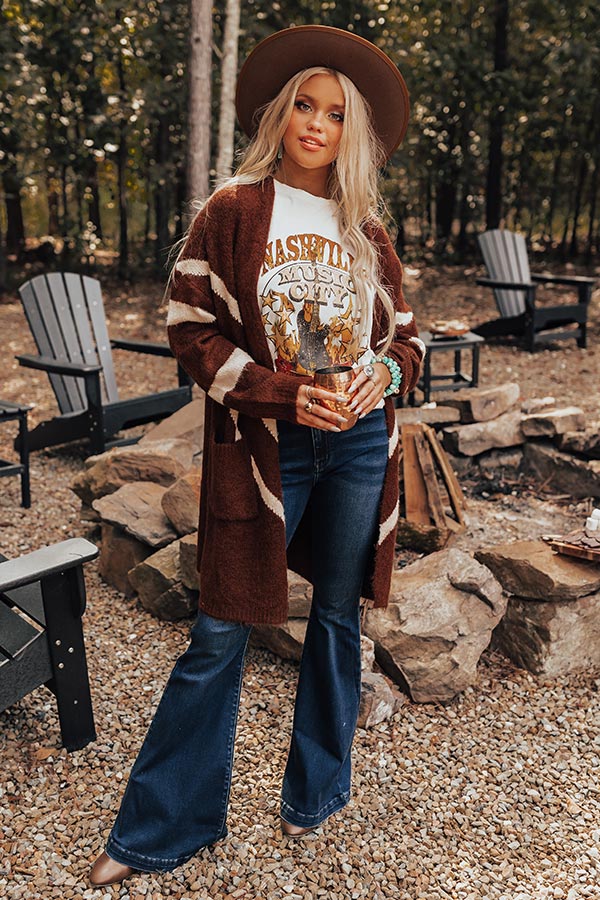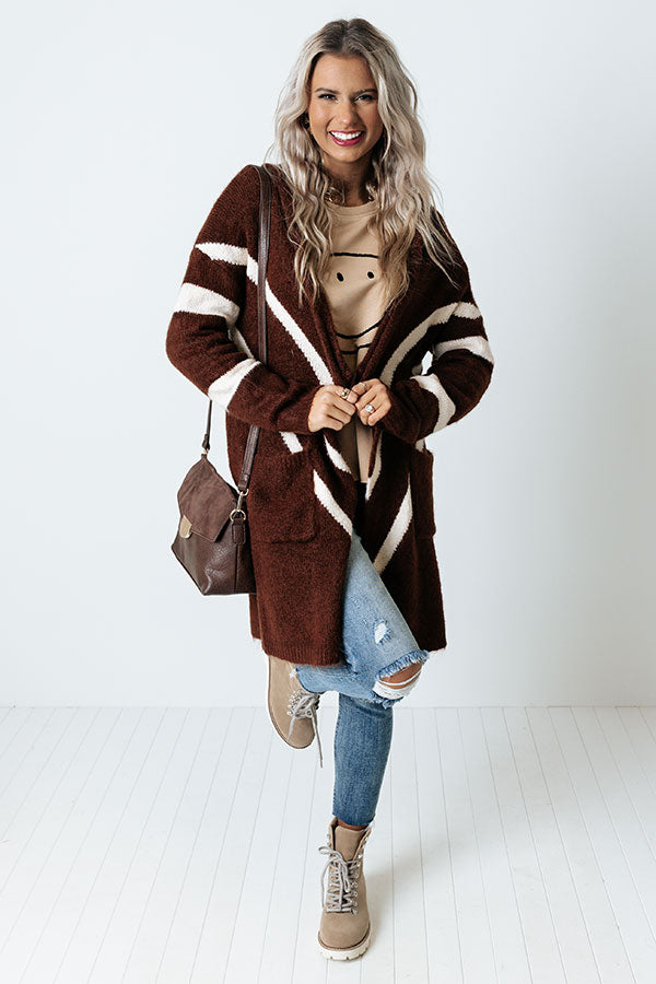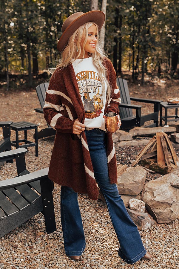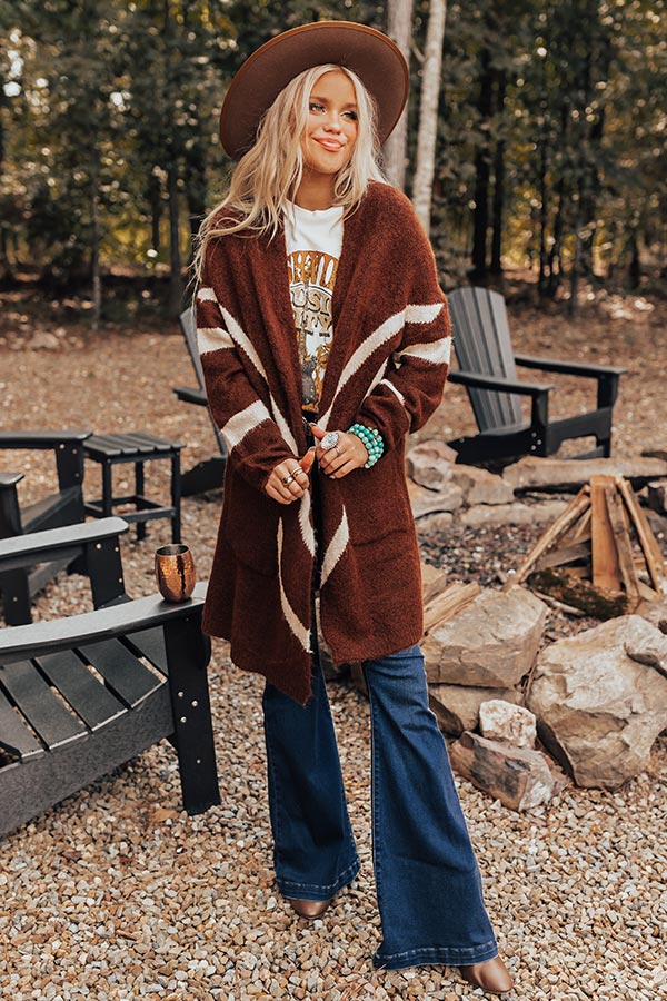 Make yourself a s'mores and relax by the fireside with this beautiful dark brown hued cardigan featuring soft knit material patterned with two ivory accent stripes, long loose sleeves, low front pockets, and a draped open front silhouette that falls into a straight knee-length hemline!