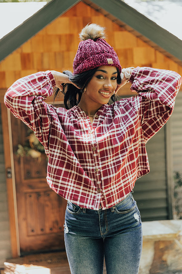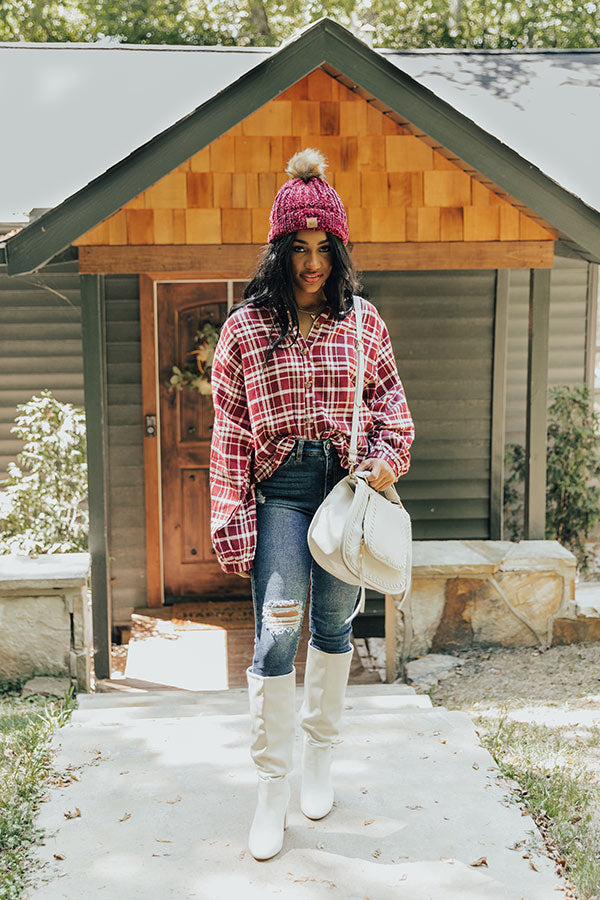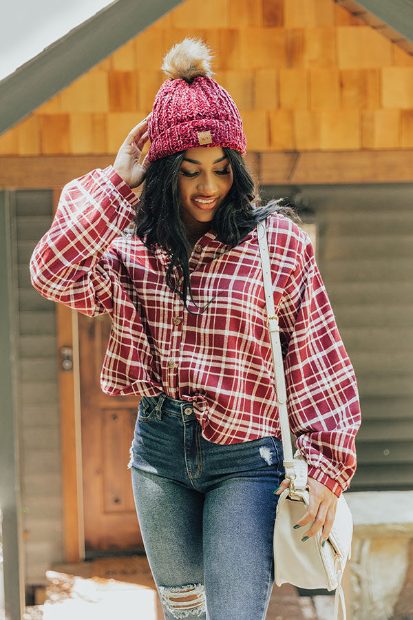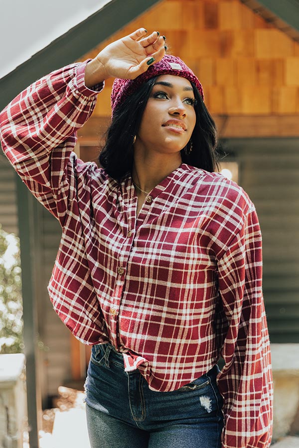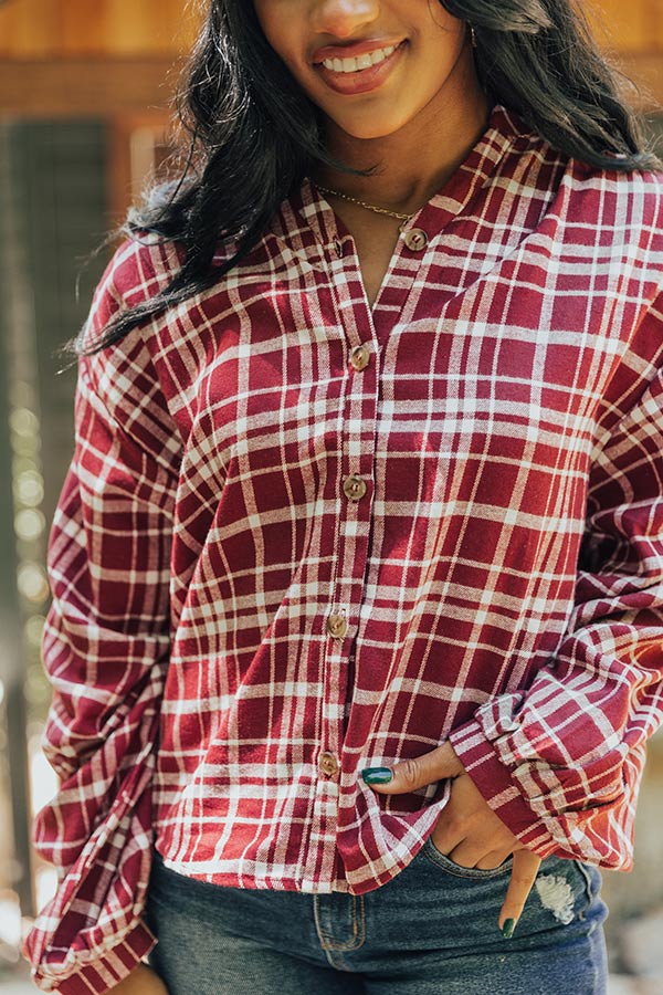 Cozy up by the fireside and eat some s'mores in this charming wine hued top featuring warm material patterned with a white plaid print, a button down front, long button down sleeves, and a relaxed silhouette that falls into a rounded hemline!
