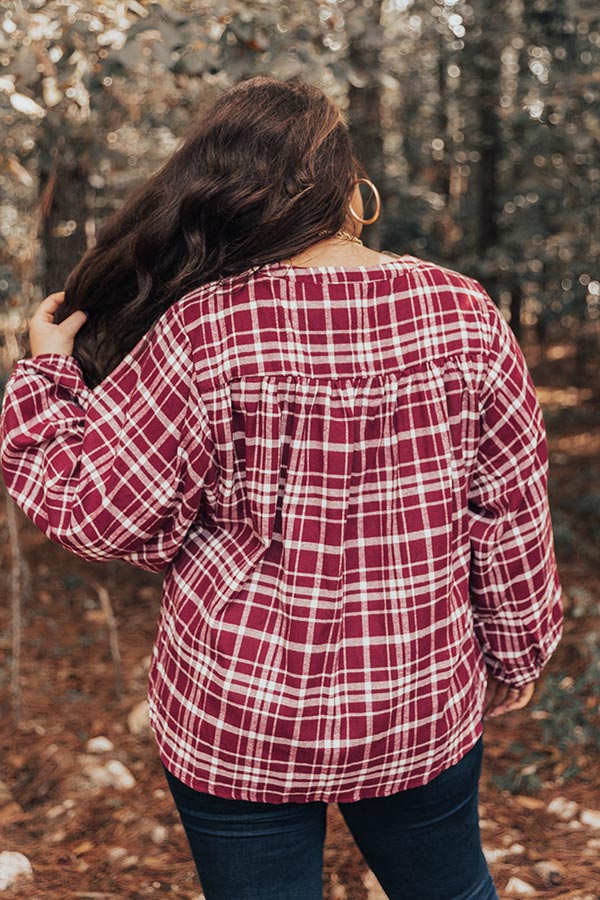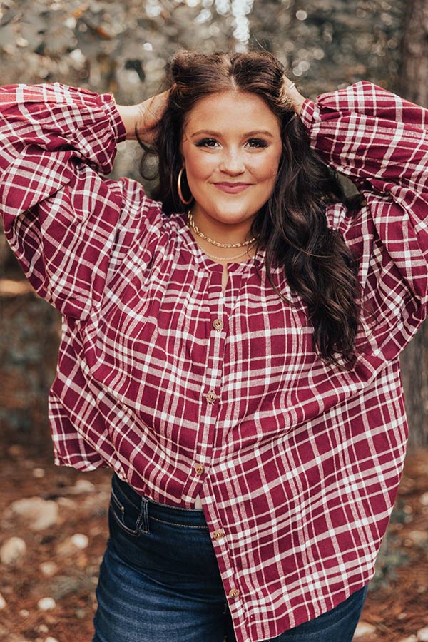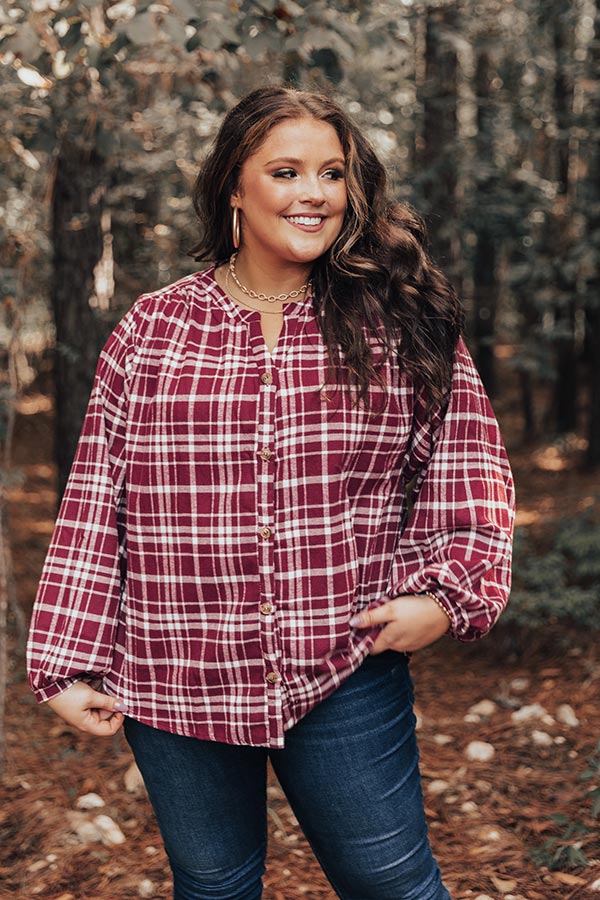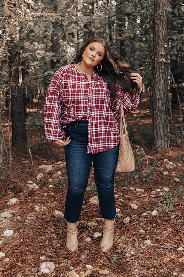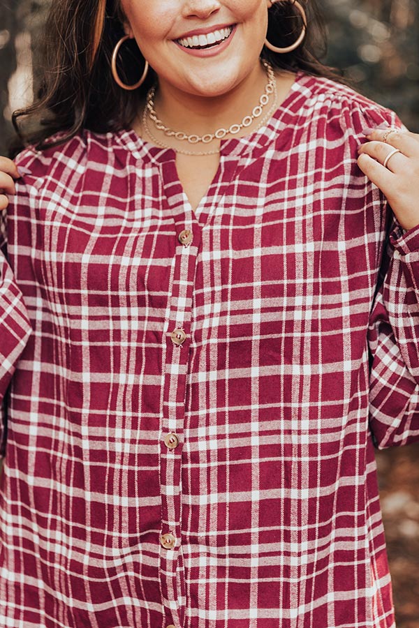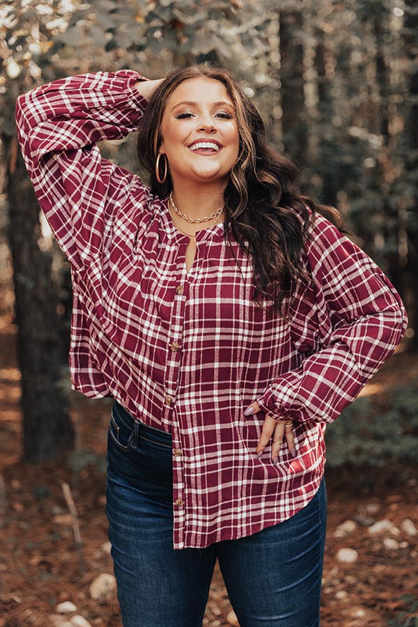 Cozy up by the fireside and eat some s'mores in this charming plus size wine hued top featuring warm material patterned with a white plaid print, a button down front, long button down sleeves, and a relaxed silhouette that falls into a rounded hemline!