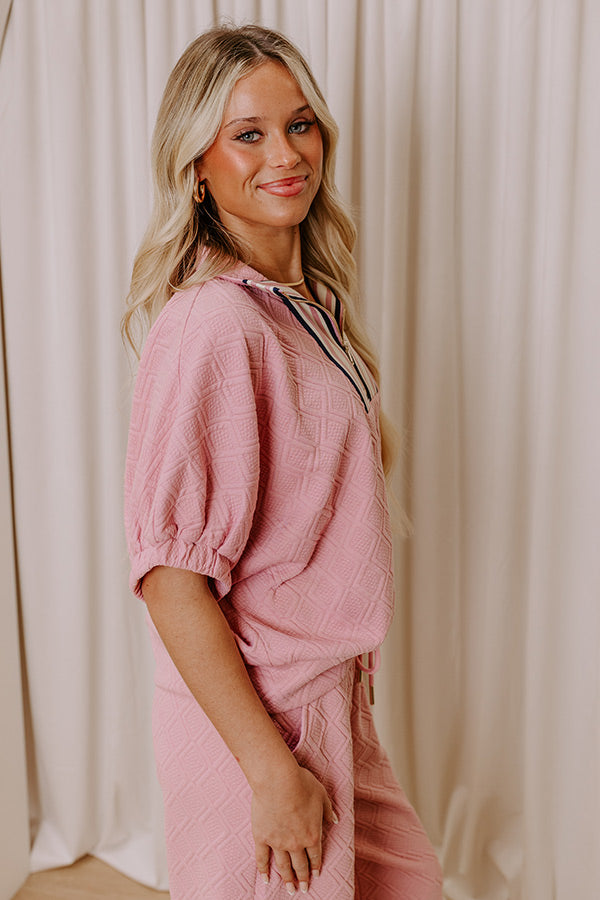 - A zippered v-cut neckline featuring cream, navy, and pink hued striped accent material