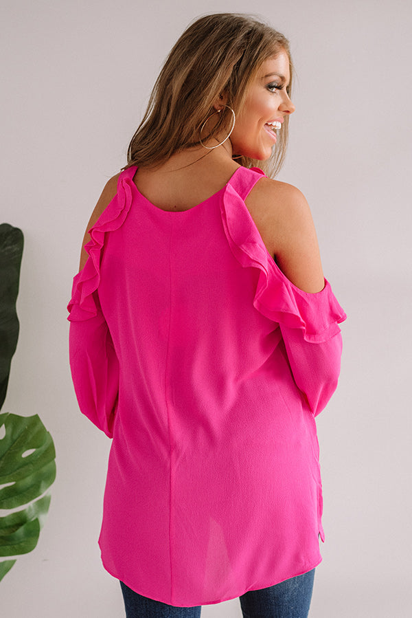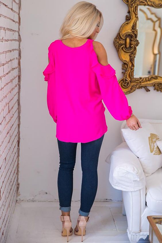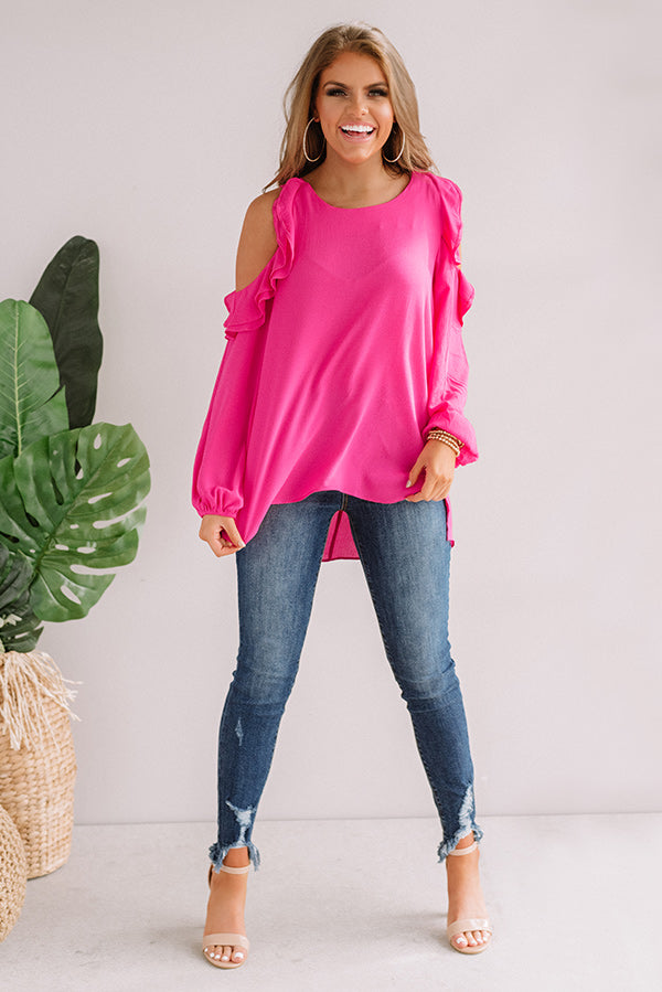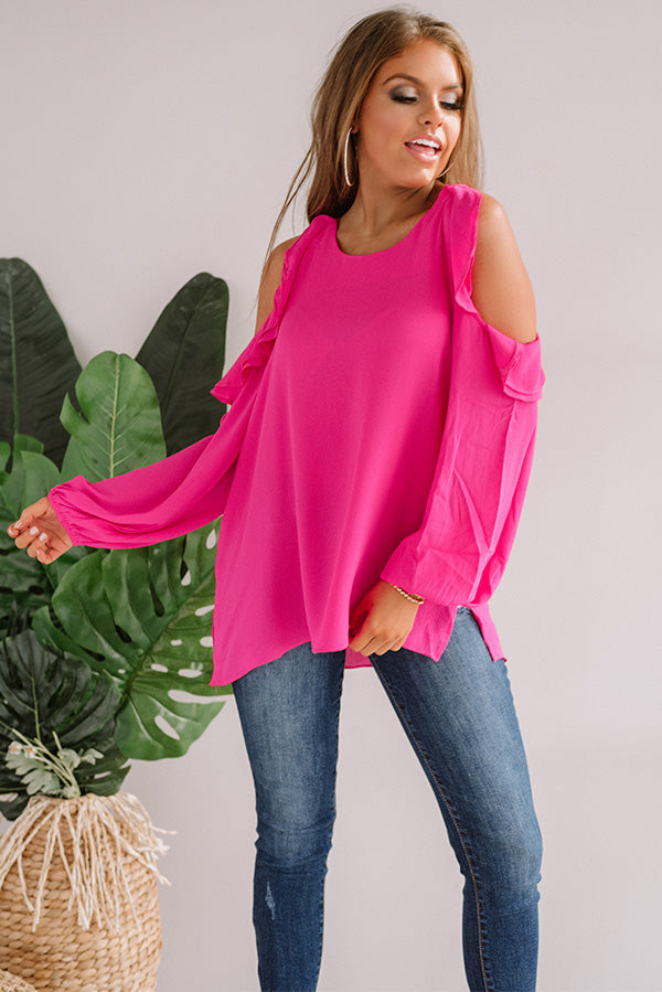 Go on your summer vacay in style with our stunning hot pink "First Class To Paris Shift Top" featuring lightweight material, a scooped neckline, long oversized sleeves with fitted elastic banded cuffs, cold shoulder accent cutouts with oversized ruffle trim detailing, and a relaxed silhouette that falls into a straight hemline with side slits! We have paired this vibrant piece with some frayed ankle skinnies and neutral heels, but you can also wear it with some distressed white shorts, "The Kamryn Stripe Sandal in Hot Pink," and our "Main Squeeze Stripe Clutch!"