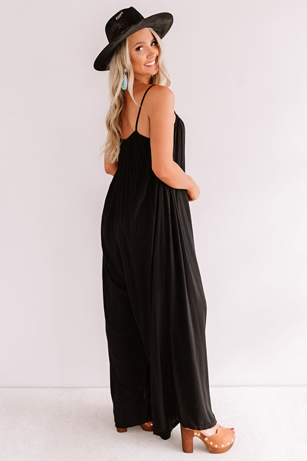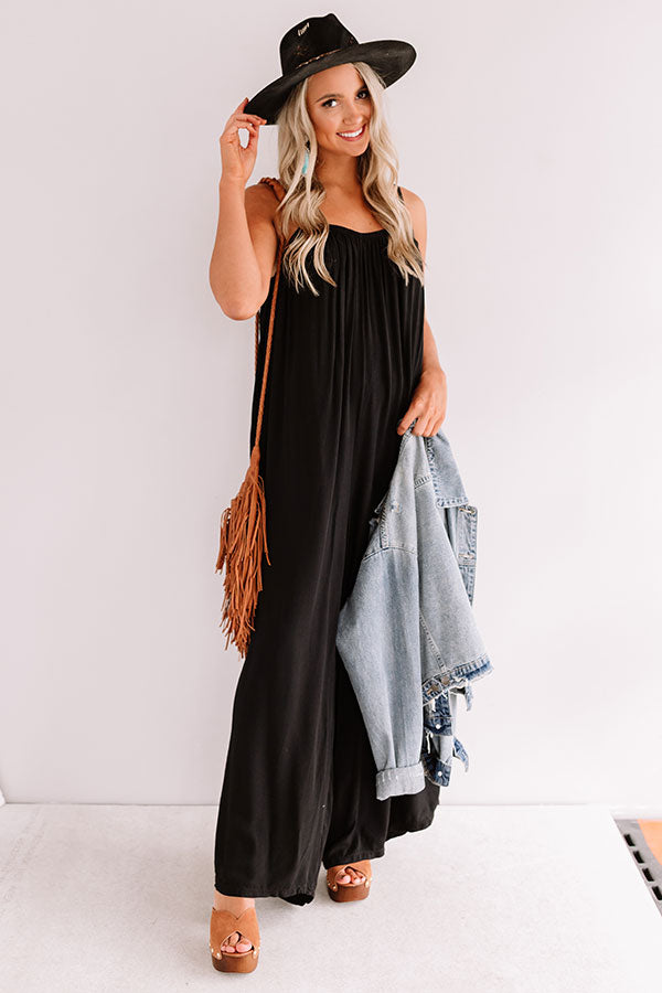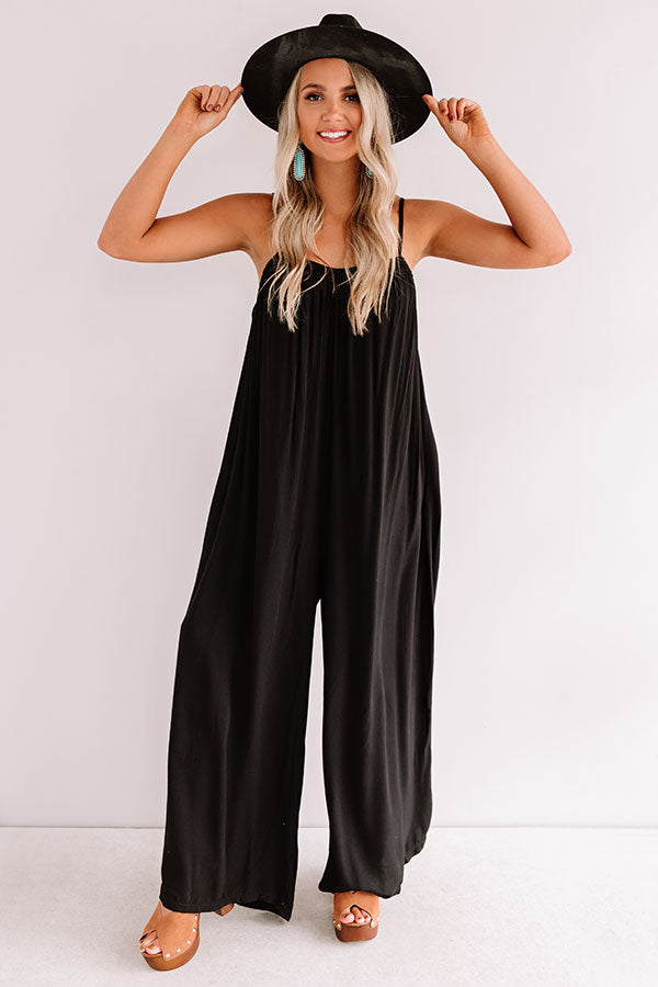 Dance from season to season if effortless style with this flirty black jumpsuit featuring lightweight breezy material, a scooped v-cut neckline and low back, spaghetti straps, and an ultra relaxed silhouette that falls into straight floor-length hemlines! Measurements