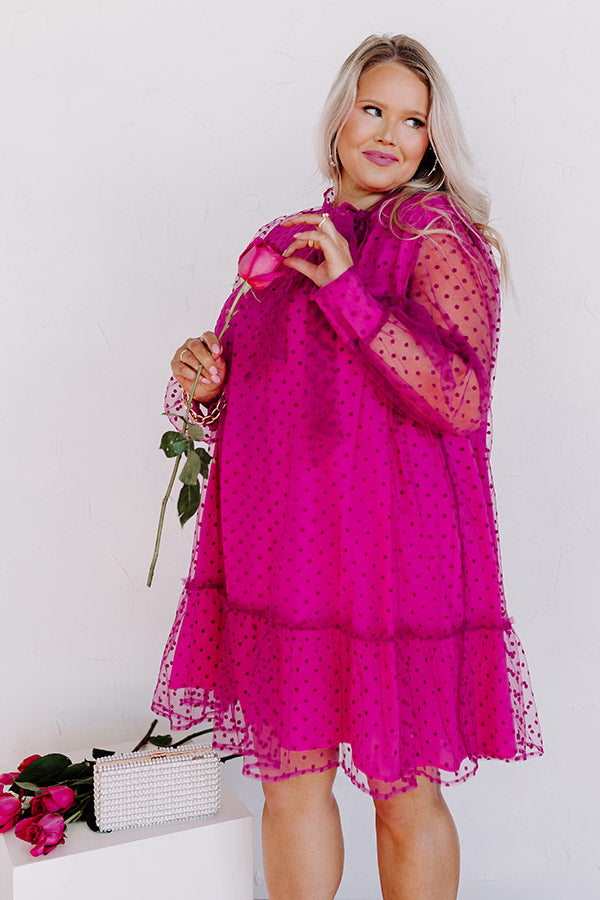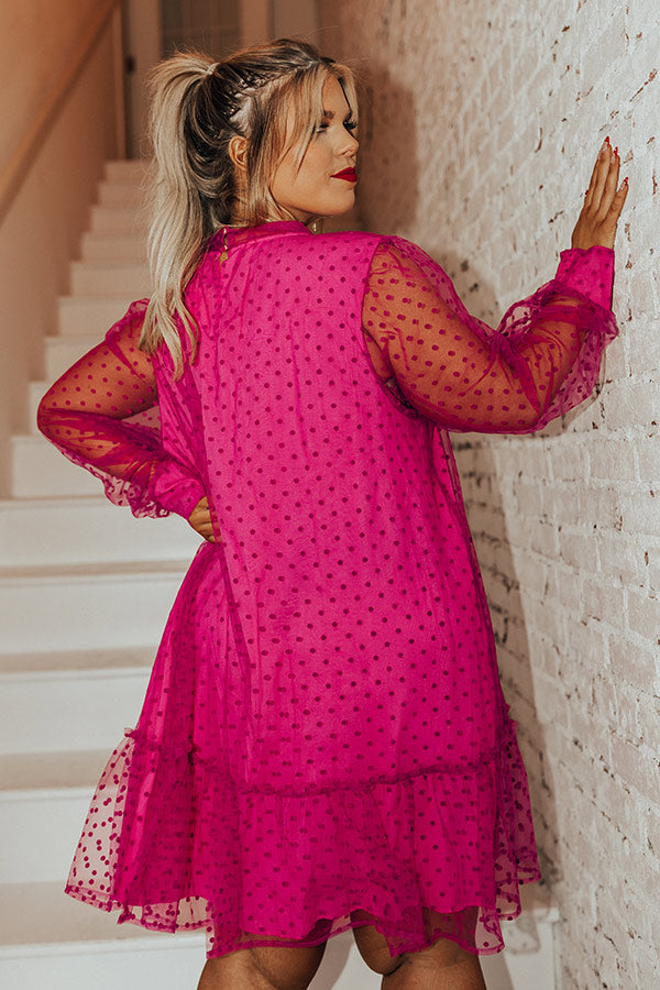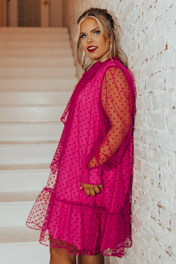 You will look a total babe in our fabulous 'First Kiss Dreaming Dress In Fuchsia'! Features a soft slip overlaid by a lightweight chiffon material patterned with a polka dot design, a round tie neckline with two button closure on back, long sleeves with smocked cuffs, and a very feminine and flattering silhouette that ends with a straight hemline and accent ruffle.