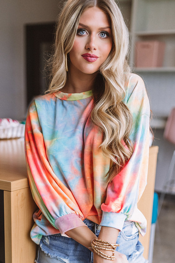 Stay wild flower child in our orange "First Kiss" sweatshirt featuring soft lightweight material patterned with colorful tie dye, a high rounded neckline, a wrapped low open back with a strap closure, loose 3/4-length sleeves with fitted cuffs, and a relaxed silhouette that falls into an uneven hemline! You can style this cutie a variety of ways, like with some distressed denim shorts, but you can also wear it with some white flares, "The Mckenna Wedge," our "Amalfi Bound Tote in Tan," and our "Laying Out In Laguna Hat!" Measurements