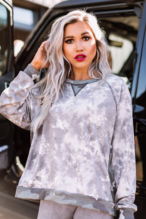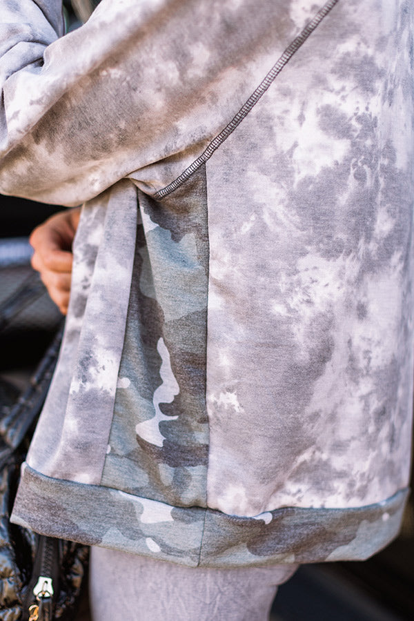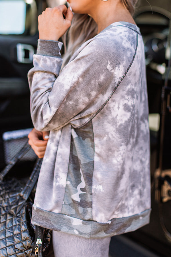 You wills surely be first place in any style competition when you wear this adorable shift top featuring soft lightweight material patterned with grey hued tie dye and camo accent panels down the side and trim, a high rounded neckline, long loose sleeves with fitted cuffs, and a slouched silhouette that ends in a straight hemline!