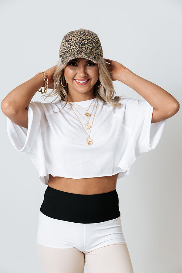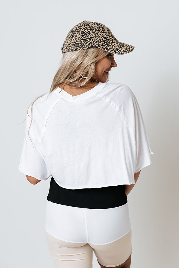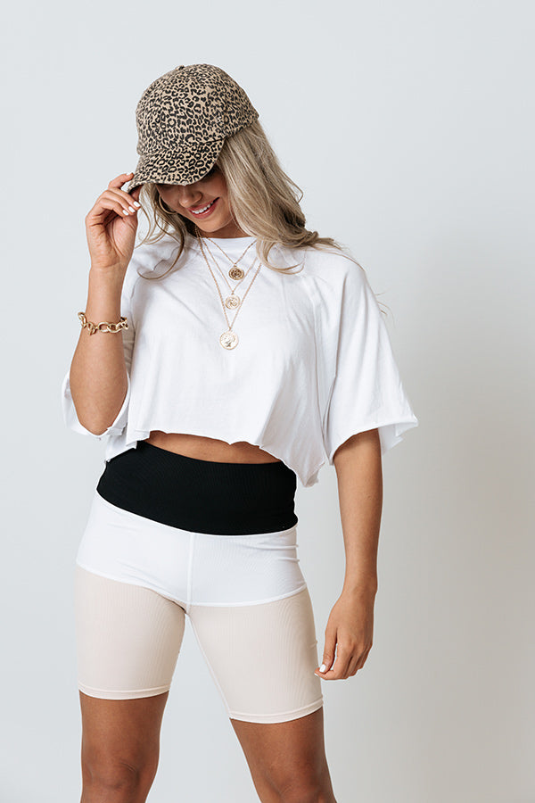 You won't find am ore versatile athleisure piece than our trendy white 'Fitness Forever' top featuring soft lightweight material, a high rounded neckline, short loose sleeves, and a slouched silhouette that ends in an uneven cropped hemline!