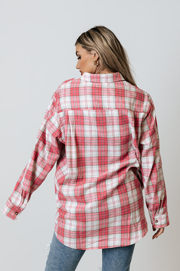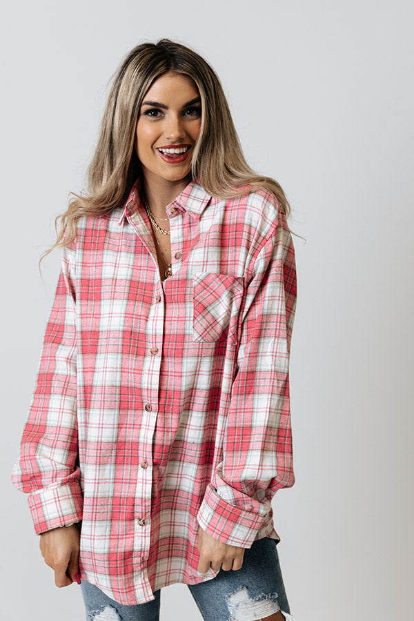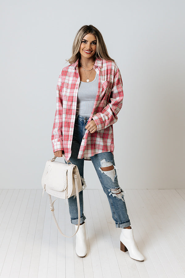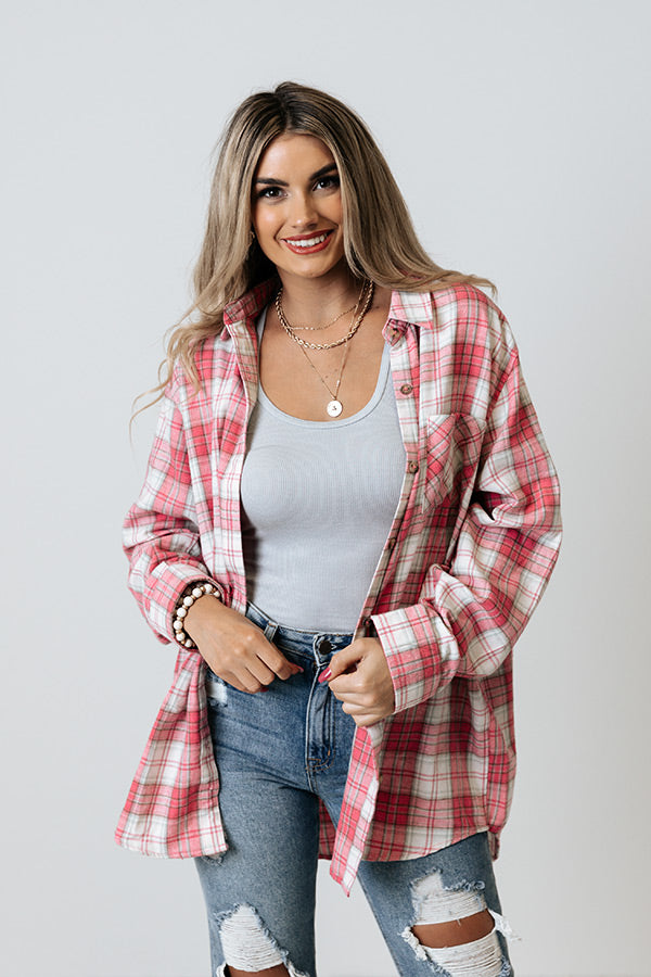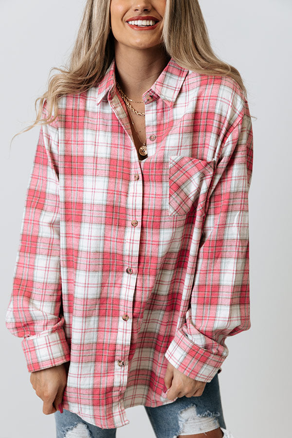 Believe us when we say this adorable flannel featuring soft material patterned with a pink plaid print, a button up front with a collared neckline, long loose sleeves with button closure cuffs, a single accent chest pocket, and a relaxed silhouette that falls into a rounded hemline! Measurements