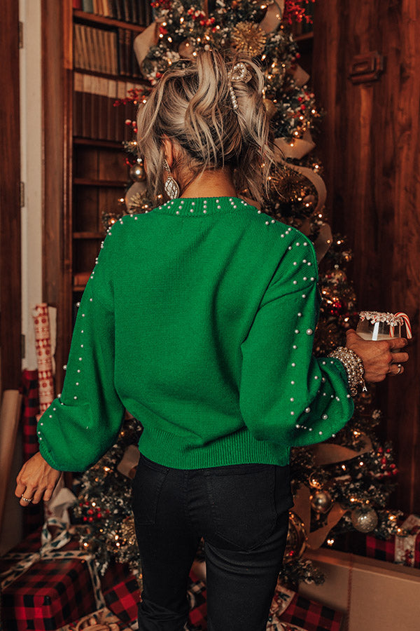 This trendy 'Flash A Smile' sweater is soft and stunning! Features a rich green color embellished with pearly beads, a crew neckline, long loose sleeves with ribbed cuffs, and a flattering silhouette with a ribbed hemline.