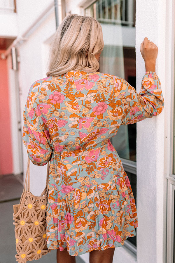 Be your own muse in our beautiful light blue 'Flip The Script' dress featuring lightweight material patterned with a pink and orange hued floral print, a v-cut neckline, long loose sleeves, a cinched waistline with a tie closure, and a relaxed silhouette that falls into a straight mid-thigh length hemline!