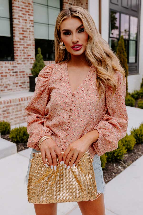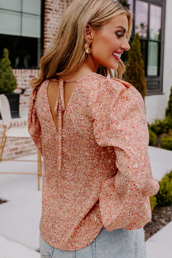 Flirt your way from season to season with this charming peach colored shift top featuring lightweight flowy material patterned with a small white and natural hued floral print, a button down front with a v-cut neckline and upper back with a tie closure, long oversized sleeves, and a relaxed silhouette that falls into a straight hemline!