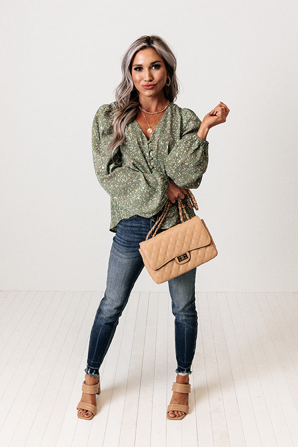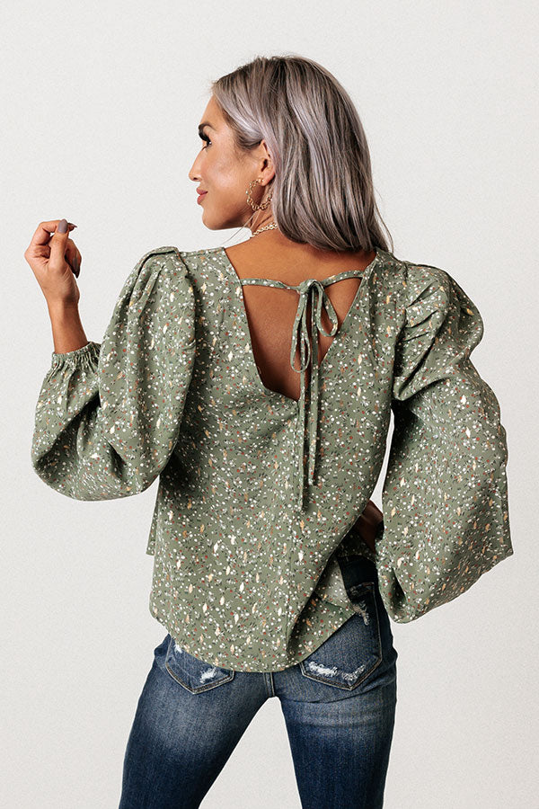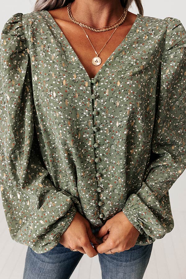 Flirt your way from season to season with this charming pear colored shift top featuring lightweight flowy material patterned with a small white and natural hued floral print, a button down front with a v-cut neckline and upper back with a tie closure, long oversized sleeves, and a relaxed silhouette that falls into a straight hemline!