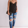 Your amazing style won't be "flirting with fate" when you wear this black tank featuring lightweight silky satin material, a lace trim v-cut neckline and back, spaghetti straps, and an ultra relaxed bodice that falls into a straight hemline! We have styled this piece for summer with some distressed ankle skinnies, a clutch, and a simple neutral heel, but you can pair it under our "California Cool Down Knit Cardigan in Sage" with a denim skirt, a grey faux suede hat, and "The Haven Faux Suede Knee High Boot in Grey" for a fashionable fall OOTD! Measurements