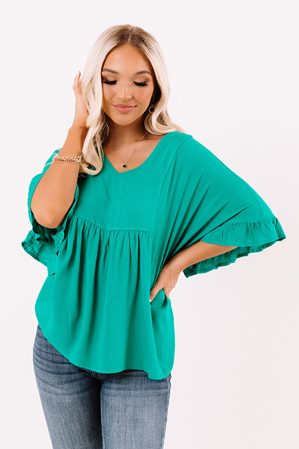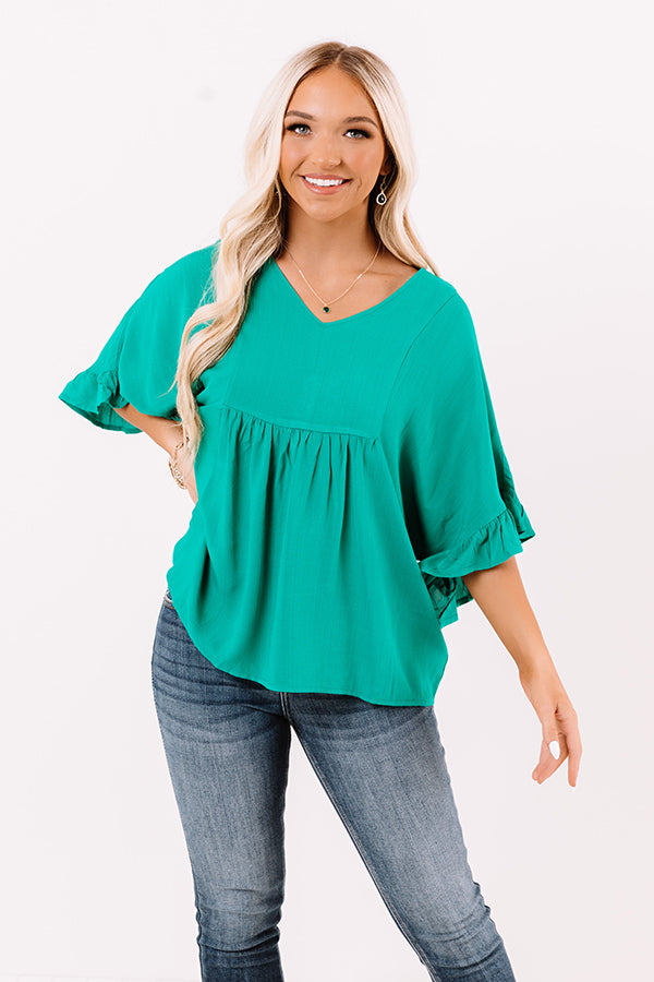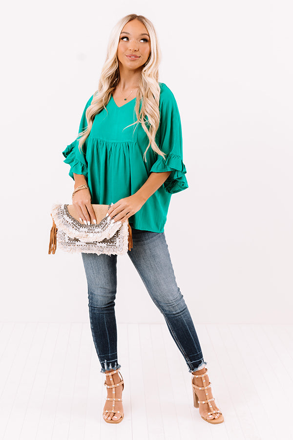 We have no doubt this flirty emerald colored top will be a new fave of your with its lightweight flowy material, v-cut neckline, loose half sleeves with oversized ruffle trim detailing, and a relaxed babydoll silhouette that falls into a straight hemline! Measurements