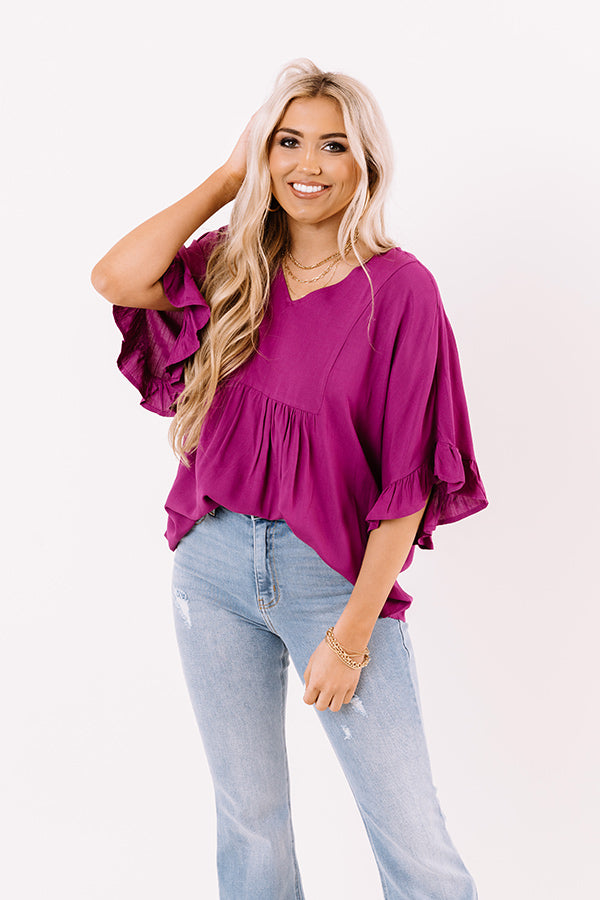We have no doubt this flirty orchid colored top will be a new fave of your with its lightweight flowy material, v-cut neckline, loose half sleeves with oversized ruffle trim detailing, and a relaxed babydoll silhouette that falls into a straight hemline! Measurements