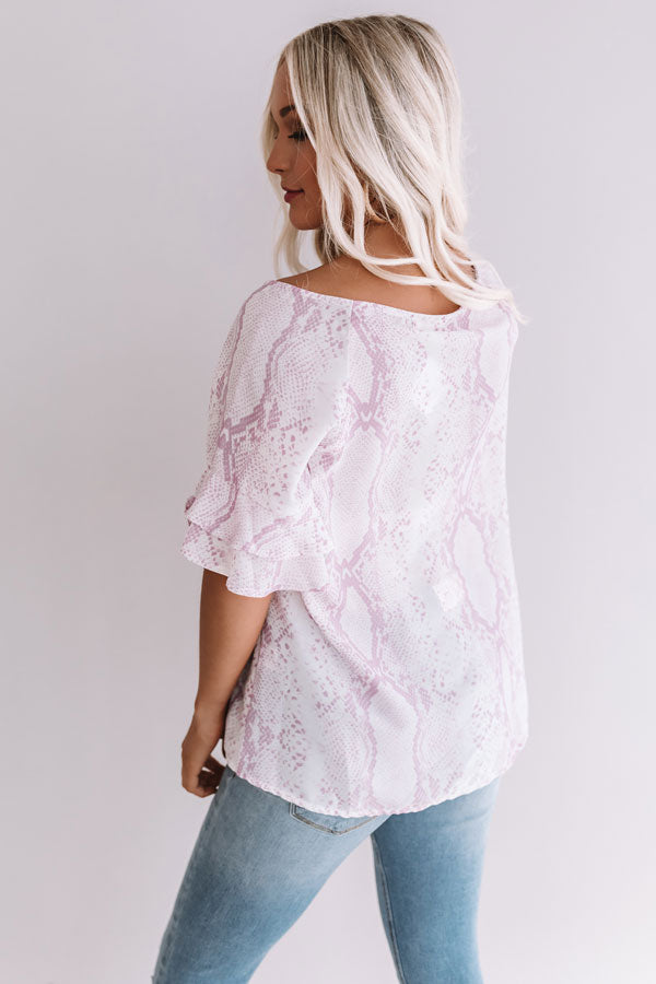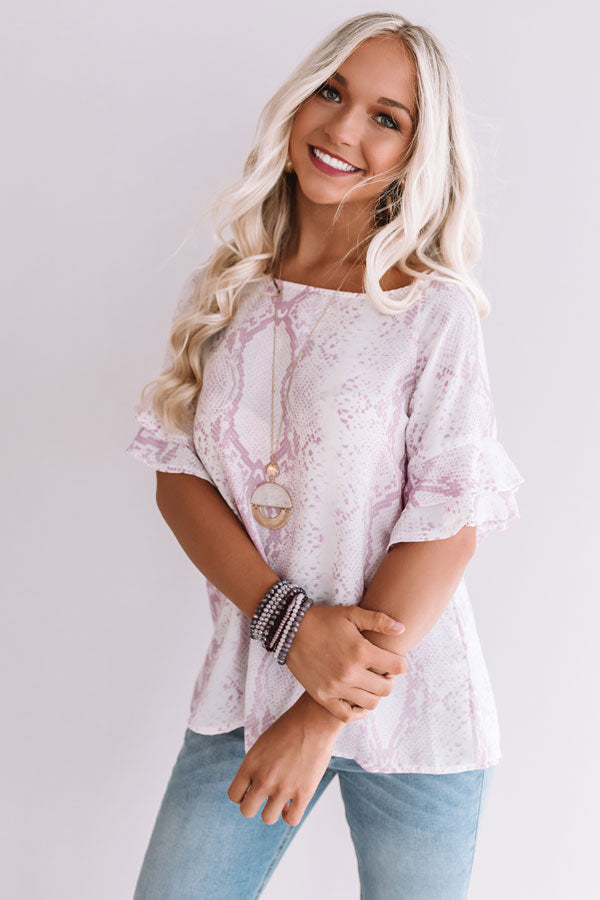 Stay sassy and classy in this flirty top that features a blush snake print pattern and ruffled sleeves! Style with some distressed light wash jeans, neutral wedges, a bright clutch, and a long necklace for a casual date night look!
