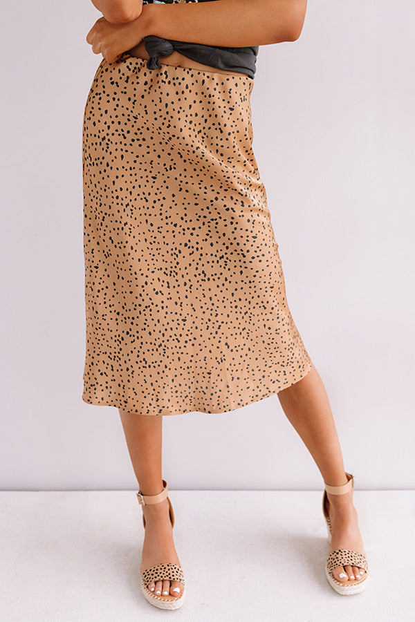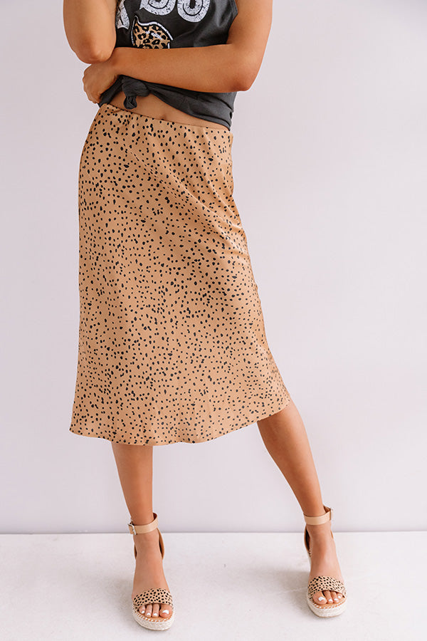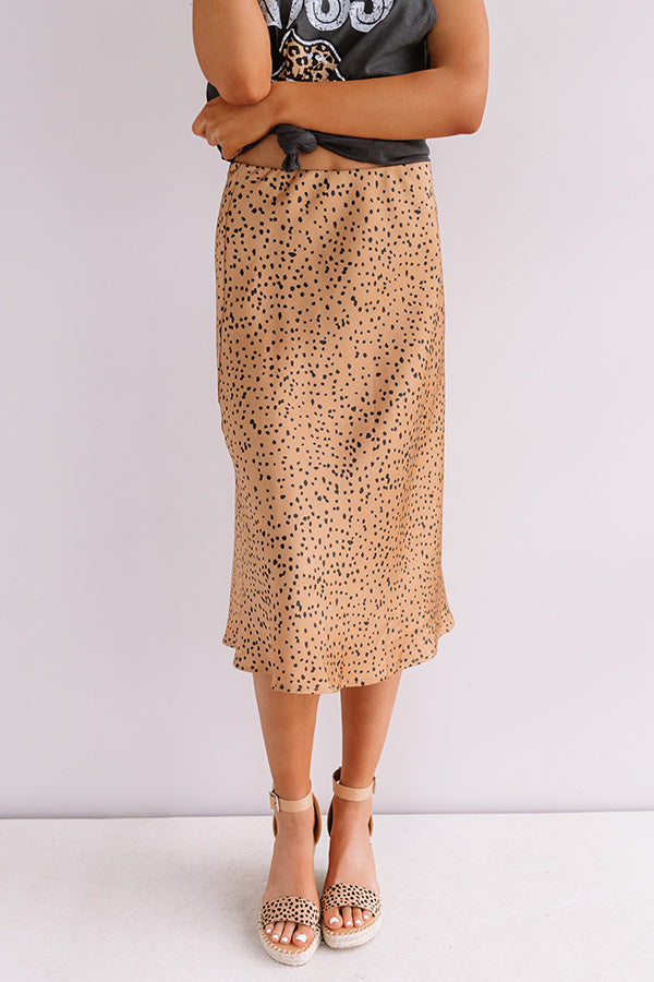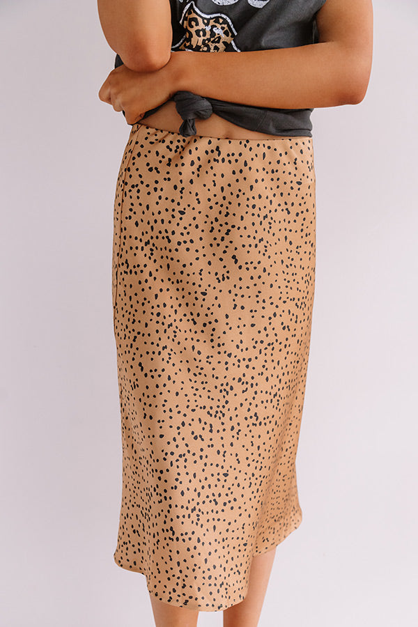 All eyes are sure to be on you when you wear this flirty camel colored midi skirt featuring sleek lightweight satin material patterned with a black cheetah print, an elastic waistline that can also be worn high waisted, and a relaxed silhouette that falls into a straight mid-thigh length hemline! You can style this cutie a variety of ways, like dressed down with a distressed boyfriend tee and matching wedges, but you can also style it up with our "Fireside Feelings Knit Sweater in Ivory," our "Travel Abroad Faux Leather Crossbody in Black," and "The Jess Faux Suede Heel in Natural!" Measurements