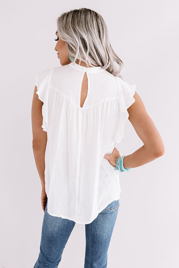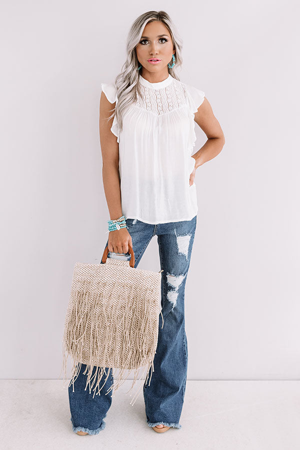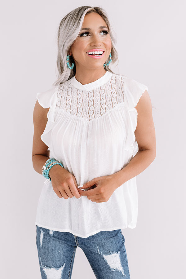 You are sure to turn heads in this flirty white top featuring ultra lightweight material with intricate semi-sheer lace detailing across the bodice, a high rounded neckline, ruffled cap sleeves, a keyhole accented upper back with a button closure, and a relaxed silhouette that falls into a rounded hemline! This cutie styles perfectly a variety of ways, like with some distressed flares, turquoise statement jewelry, and a woven tote, but you can also wear it under a cropped denim jacket with some frayed black shorts, "The Kamryn Stripe Sandal in Hot Pink" and our hot pink "Jetsetter Chic Hair Scarf!"