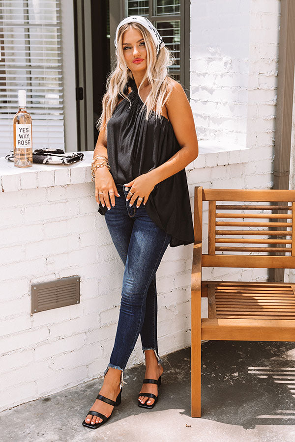 You will feel like you are floating on air when you wear this effortlessly chic black shift top featuring lightweight flowy material, a diagonal neckline and upper back with a single tie closure shoulder strap, and an ultra draped silhouette that falls into a straight tunic-length hemline!