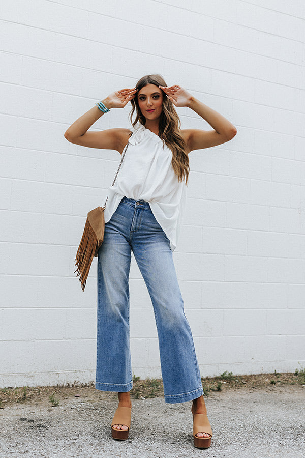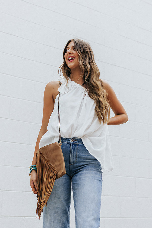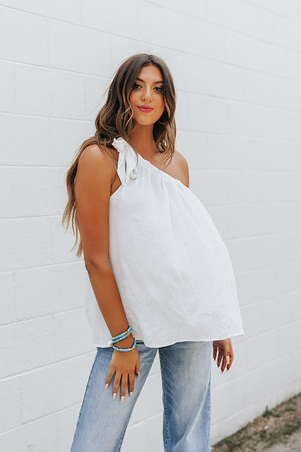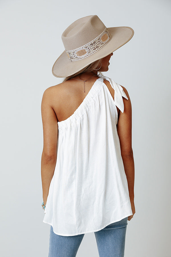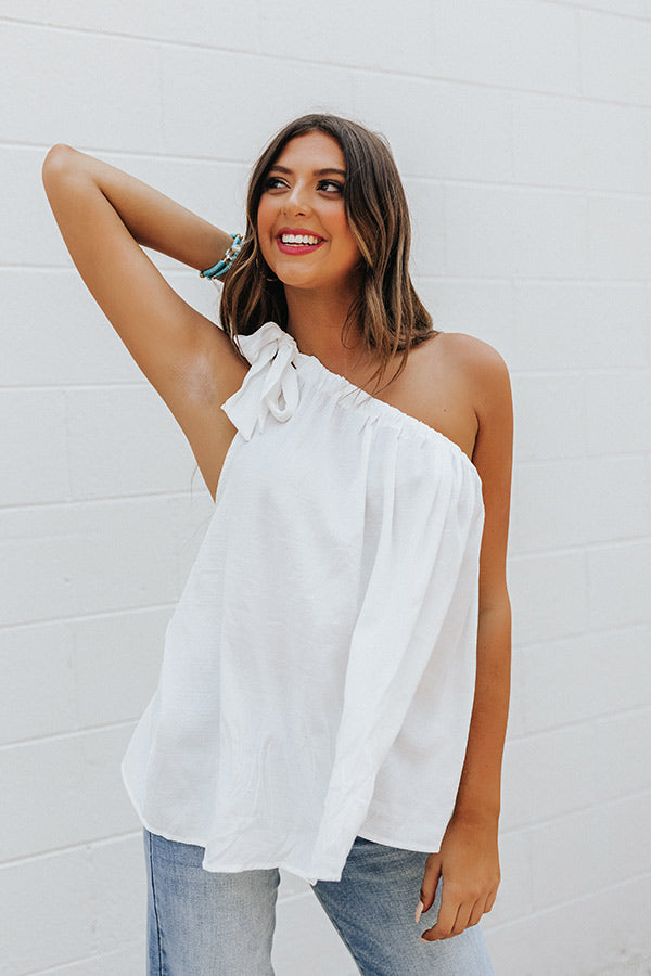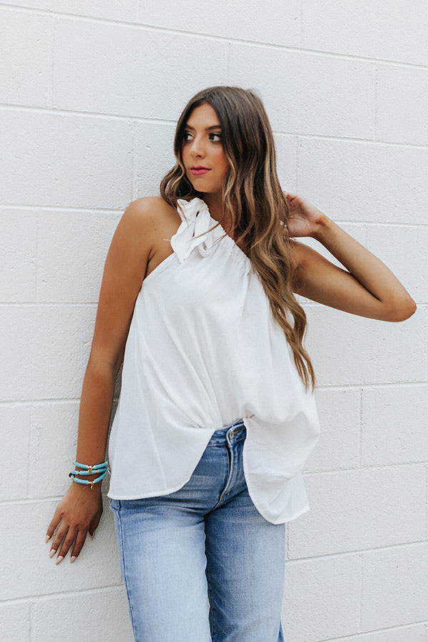 You will feel like you are floating on air when you wear this effortlessly chic white shift top featuring lightweight flowy material, a diagonal neckline and upper back with a single tie closure shoulder strap, and an ultra draped silhouette that falls into a straight tunic-length hemline!
