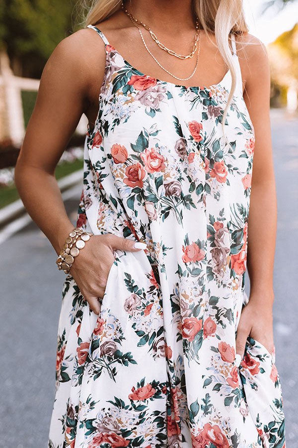 Dress to impress in our darling white 'Floral Ever After Maxi Dress' featuring lightweight and flowy material patterned with an intricate coral and green hued floral print, a scooped neckline, adjustable spaghetti straps with a low back, hidden side pockets, and an ultra relaxed but flattering silhouette that cascades into a straight floor-length hemline! Measurements