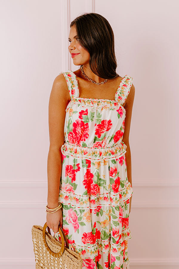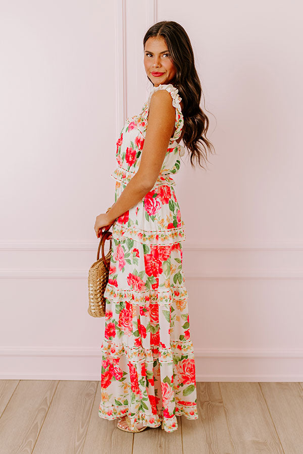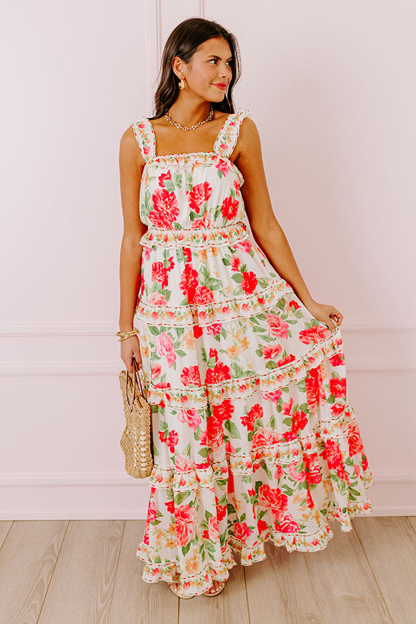 - A flowy tiered silhouette that ends in a maxi length hemline