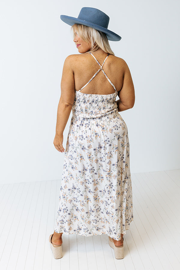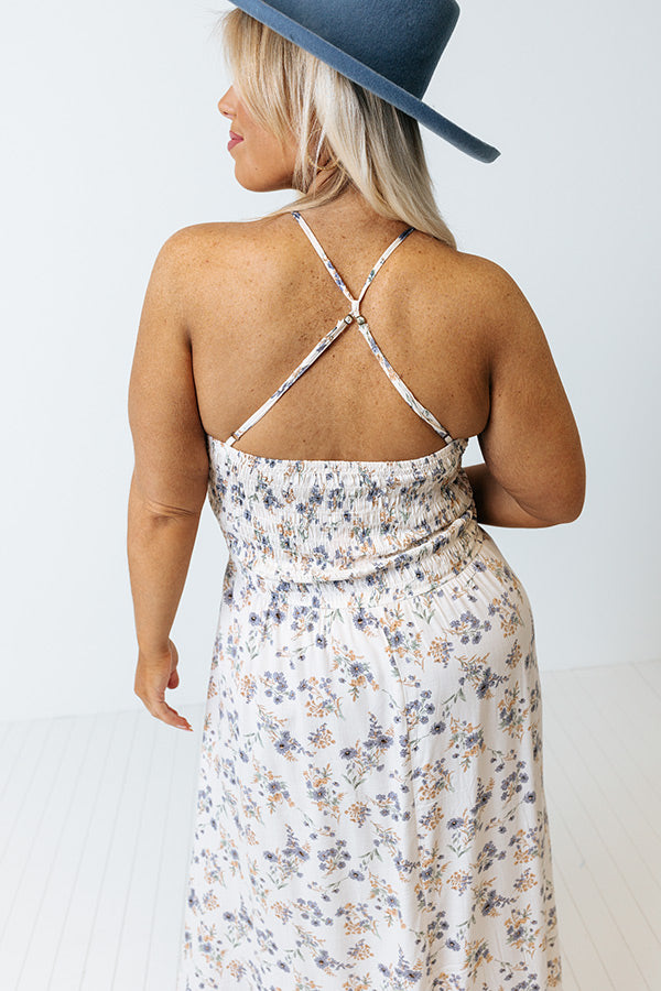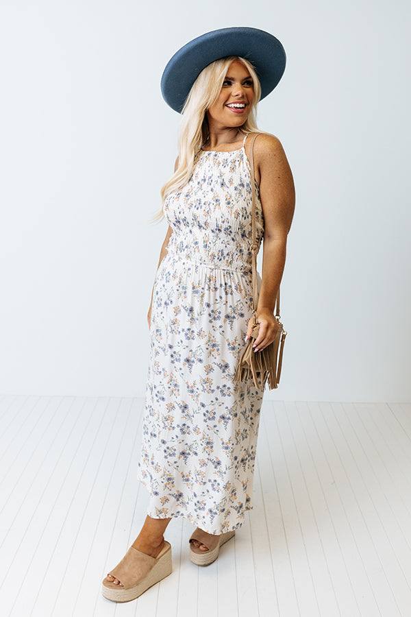 Plus Size - People's gazes are guaranteed to be on you when you arrive in this beautiful dress featuring lightweight material patterned with a small blue and natural hued floral print, a high neckline with adjustable spaghetti straps that cross in the back, and a relaxed silhouette that cascades into a straight ankle-length hemline!