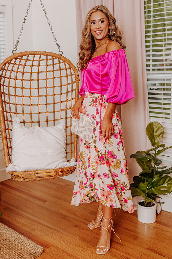 Show up and show out in our beautiful 'Floral Paradise' skirt featuring lightweight material patterned with a bold fuchsia, peach, and olive green hued floral print, a high waistline with a side tie closure, and a flattering wrap silhouette that ends in a mid-calf length tulip hemline! on products