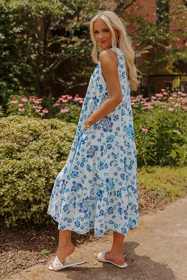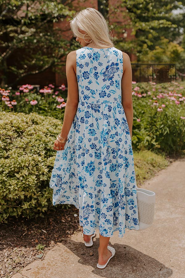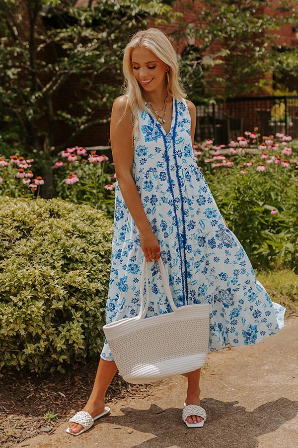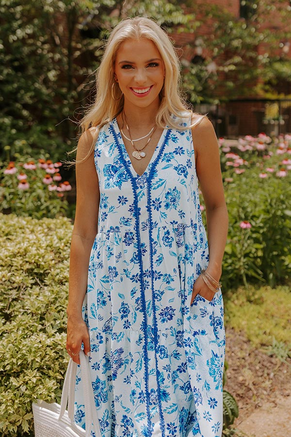 Head to brunch in style with our dreamy white 'Flower Market Midi' dress featuring lightweight material patterned with a pretty royal blue and sky blue floral print, a v-cut neckline, wide sleeveless shoulder straps, hidden side pocket, and a relaxed silhouette that falls into a straight mid-calf length hemline!